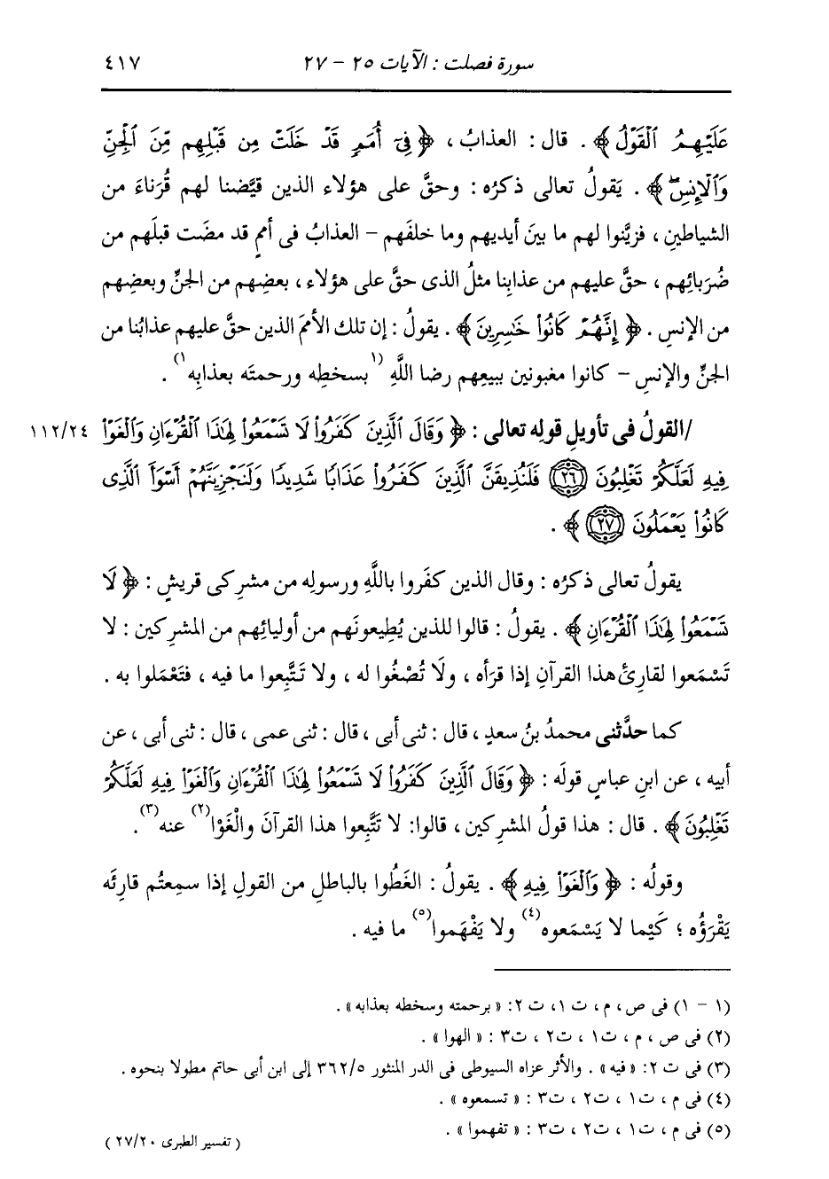 §الْقَوْلُ فِي تَأْوِيلِ قَوْلِهِ تَعَالَى: {وَقَالَ الَّذِينَ كَفَرُوا لَا تَسْمَعُوا لِهَذَا الْقُرْآنِ وَالْغَوْا فِيهِ لَعَلَّكُمْ تَغْلِبُونَ فَلَنُذِيقَنَّ الَّذِينَ كَفَرُوا عَذَابًا شَدِيدًا وَلَنَجْزِيَنَّهُمْ أَسْوَأَ الَّذِي كَانُوا يَعْمَلُونَ} [فصلت: 27] يَقُولُ تَعَالَى ذِكْرُهُ: {وَقَالَ الَّذِينَ كَفَرُوا} [إبراهيم: 13] بِاللَّهِ وَرَسُولِهِ مِنْ مُشْرِكِي قُرَيْشٍ: {لَا تَسْمَعُوا لِهَذَا الْقُرْآنِ وَالْغَوْا فِيهِ} [فصلت: 26] يَقُولُ: قَالُوا لِلَّذِينَ يُطِيعُونَهُمْ مِنْ أَوْلِيَائِهِمْ مِنَ الْمُشْرِكِينَ: لَا تَسْمَعُوا لِقَارِئِ هَذَا الْقُرْآنِ إِذَا قَرَأَهُ، وَلَا تُصْغُوا لَهُ، وَلَا تَتَّبِعُوا مَا فِيهِ فَتَعْمَلُوا بِهِ