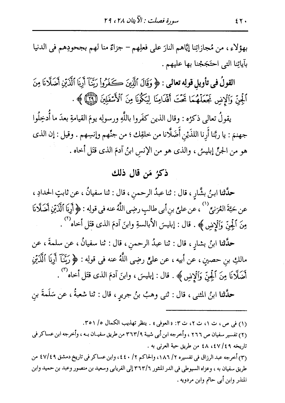 حَدَّثَنَا ابْنُ بَشَّارٍ، قَالَ: ثنا عَبْدُ الرَّحْمَنِ، قَالَ: ثنا سُفْيَانُ، عَنْ سَلَمَةَ، عَنْ مَالِكِ بْنِ حُصَيْنٍ، عَنْ أَبِيهِ عَنْ عَلِيٍّ رَضِيَ اللَّهُ عَنْهُ فِي قَوْلِهِ: {§رَبَّنَا أَرِنَا الَّذَيْنِ أَضَلَّانَا مِنَ الْجِنِّ وَالْإِنْسِ} [فصلت: 29] قَالَ: «إِبْلِيسُ وَابْنُ آدَمَ الَّذِي قَتَلَ أَخَاهُ»
