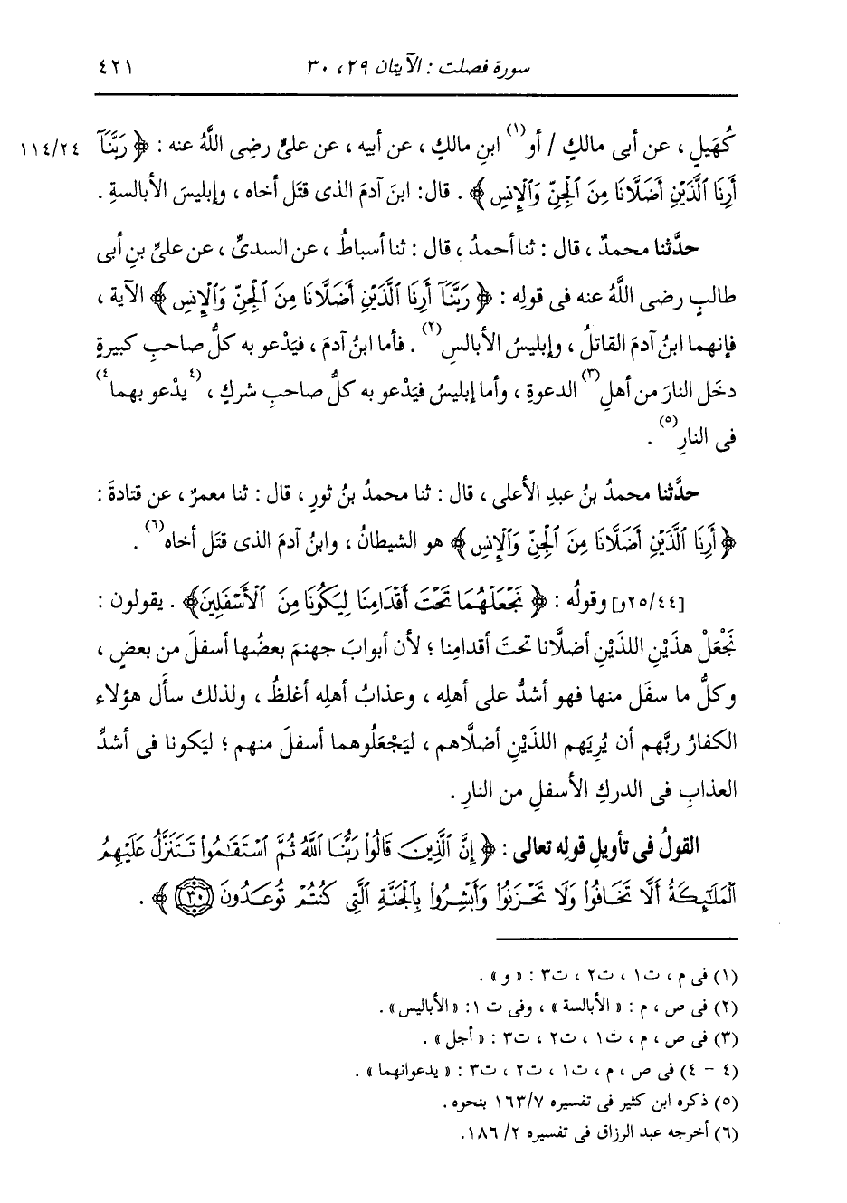 حَدَّثَنَا مُحَمَّدٌ، قَالَ: ثنا أَحْمَدُ، قَالَ: ثنا أَسْبَاطٌ، عَنِ السُّدِّيِّ، عَنْ عَلِيِّ بْنِ أَبِي طَالِبٍ رَضِيَ اللَّهُ عَنْهُ، فِي قَوْلِهِ: {§رَبَّنَا أَرِنَا اللَّذَيْنِ أَضَلَّانَا مِنَ الْجِنِّ وَالْإِنْسِ} الْآيَةَ ففَإِنَّهُمَا ابْنُ آدَمَ الْقَاتِلُ، وَإِبْلِيسُ الْأَبَالِسَةِ. فَأَمَّا ابْنُ آدَمَ فَيَدْعُو بِهِ كُلُّ صَاحِبِ كَبِيرَةٍ دَخَلَ النَّارَ مِنْ أَجْلِ الدَّعْوَةِ وَأَمَّا إِبْلِيسُ فَيَدْعُو بِهِ كُلُّ صَاحِبِ شِرْكٍ، يَدْعُوَانِهِمَا فِي النَّارِ "