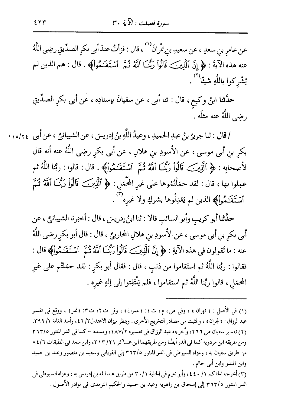 قَالَ: ثنا جَرِيرُ بْنُ عَبْدِ الْحَمِيدِ، وَعَبْدُ اللَّهِ بْنُ إِدْرِيسَ، عَنِ الشَّيْبَانِيِّ، عَنْ أَبِي بَكْرِ بْنِ أَبِي مُوسَى، عَنِ الْأَسْوَدِ بْنِ هِلَالٍ، عَنْ أَبِي بَكْرٍ، رَضِيَ اللَّهُ عَنْهُ أَنَّهُ قَالَ لِأَصْحَابِهِ {§إِنَّ الَّذِينَ قَالُوا رَبُّنَا اللَّهُ ثُمَّ اسْتَقَامُوا} [فصلت: 30] قَالَ: " قَالُوا: رَبُّنَا اللَّهُ ثُمَّ عَمِلُوا بِهَا، قَالَ: لَقَدْ حَمَلْتُمُوهَا عَلَى غَيْرِ الْمَحْمَلِ " {إِنَّ الَّذِينَ قَالُوا رَبُّنَا اللَّهُ ثُمَّ اسْتَقَامُوا} [فصلت: 30] «الَّذِينَ لَمْ يَعْدِلُوهَا بِشِرْكٍ وَلَا غَيْرِهِ»