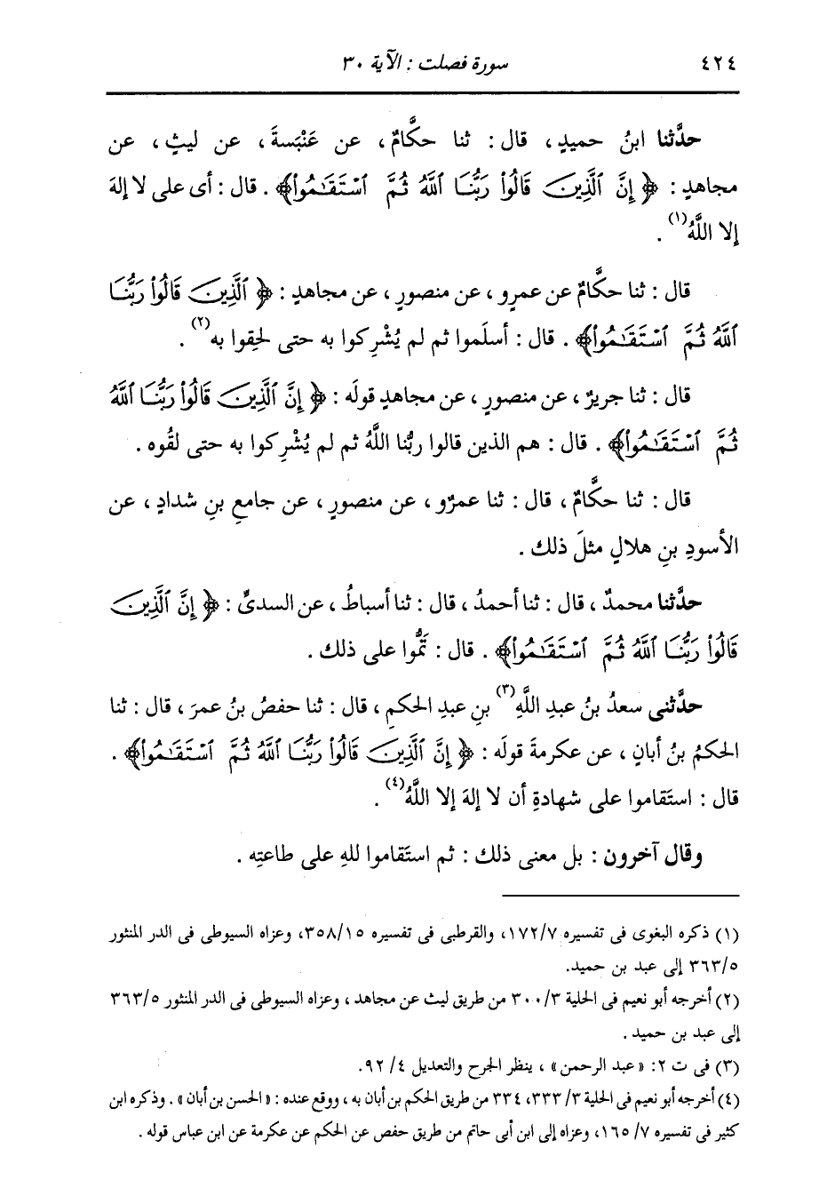 قَالَ ثنا جَرِيرٌ، عَنْ مَنْصُورٍ، عَنْ مُجَاهِدٍ قَوْلُهُ {§إِنَّ الَّذِينَ قَالُوا رَبُّنَا اللَّهُ ثُمَّ اسْتَقَامُوا} [فصلت: 30] قَالَ: «هُمُ الَّذِينَ قَالُوا رَبُّنَا اللَّهُ لَمْ يُشْرِكُوا بِهِ حَتَّى لَقُوهُ» قَالَ: ثنا حَكَّامٌ، قَالَ: ثنا عَمْرٌو، عَنْ مَنْصُورٍ، عَنْ جَامِعِ بْنِ شَدَّادٍ، عَنِ الْأَسْوَدِ بْنِ هِلَالٍ، مِثْلُ ذَلِكَ