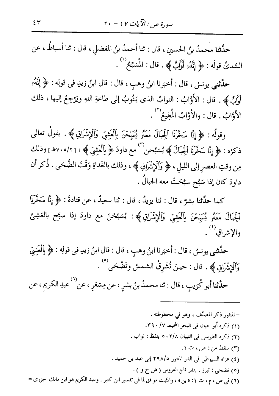 حَدَّثَنَا مُحَمَّدُ بْنُ الْحُسَيْنِ، قَالَ: ثنا أَحْمَدُ بْنُ الْمُفَضَّلِ، قَالَ: ثنا أَسْبَاطٌ، عَنِ السُّدِّيِّ، قَوْلُهُ: {§إِنَّهُ أَوَّابٌ} [ص: 17] قَالَ: «الْمُسَبِّحُ»