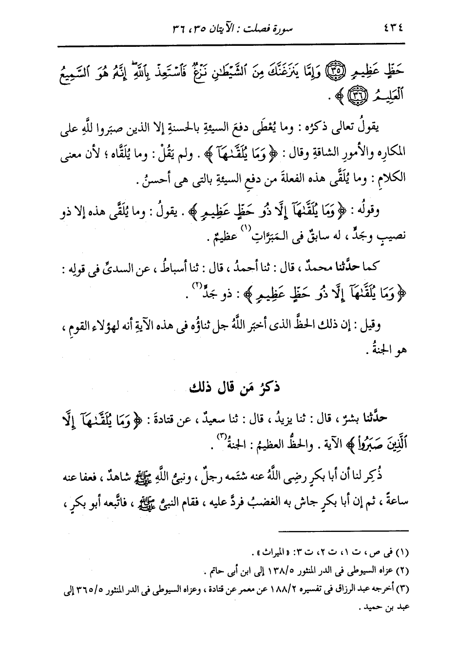 ذِكْرُ مَنْ قَالَ ذَلِكَ: حَدَّثَنَا بِشْرٌ، قَالَ: ثنا يَزِيدُ، قَالَ: ثنا سَعِيدٌ، عَنْ قَتَادَةَ، {§وَمَا يُلَقَّاهَا إِلَّا الَّذِينَ صَبَرُوا} [فصلت: 35] . . . الْآيَةَ " وَالْحَظُّ الْعَظِيمُ: الْجَنَّةُ " ذُكِرَ لَنَا أَنَّ أَبَا بَكْرٍ رَضِيَ اللَّهُ عَنْهُ شَتَمَهُ رَجُلٌ وَنَبِيُّ اللَّهِ صَلَّى اللهُ عَلَيْهِ وَسَلَّمَ شَاهِدٌ، فَعَفَا عَنْهُ سَاعَةً، ثُمَّ إِنَّ أَبَا بَكْرٍ جَاشَ بِهِ الْغَضَبُ، فَرَدَّ عَلَيْهِ، فَقَامَ النَّبِيُّ صَلَّى اللهُ عَلَيْهِ وَسَلَّمَ فَاتَّبَعَهُ أَبُو بَكْرٍ، -[435]- فَقَالَ يَا رَسُولَ اللَّهِ شَتَمَنِي الرَّجُلُ، فَعَفَوْتُ وَصَفَحْتُ وَأَنْتَ قَاعِدٌ، فَلَمَّا أَخَذْتُ أَنْتَصِرُ قُمْتَ يَا نَبِيَّ اللَّهِ، فَقَالَ نَبِيُّ اللَّهِ صَلَّى اللهُ عَلَيْهِ وَسَلَّمَ: «إِنَّهُ كَانَ يَرُدُّ عَنْكَ مَلَكٌ مِنَ الْمَلَائِكَةِ، فَلَمَّا قَرِبْتَ تَنْتَصِرُ ذَهَبَ الْمَلِكُ وَجَاءَ الشَّيْطَانُ، فَوَاللَّهِ مَا كُنْتُ لَأُجَالِسُ الشَّيْطَانَ يَا أَبَا بَكْرٍ»