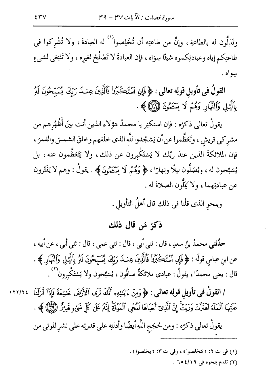 §الْقَوْلُ فِي تَأْوِيلِ قَوْلِهِ تَعَالَى: {فَإِنِ اسْتَكْبَرُوا فَالَّذِينَ عِنْدَ رَبِّكَ يُسَبِّحُونَ لَهُ بِاللَّيْلِ وَالنَّهَارِ وَهُمْ لَا يَسْأَمُونَ} [فصلت: 38] يَقُولُ تَعَالَى ذِكْرُهُ: فَإِنِ اسْتَكْبَرَ يَا مُحَمَّدُ هَؤُلَاءِ الَّذِينَ أَنْتَ بَيْنَ أَظْهُرِهِمْ مِنْ مُشْرِكِي قُرَيْشٍ، وَتَعَظَّمُوا عَنْ أَنَّ يَسْجُدُوا لِلَّهِ الَّذِي خَلَقَهُمْ وَخَلَقَ الشَّمْسَ وَالْقَمَرَ، فَإِنَّ الْمَلَائِكَةَ الَّذِينَ عِنْدَ رَبِّكَ لَا يَسْتَكْبِرُونَ عَنْ ذَلِكَ، وَلَا يَتَعَظَّمُونَ عَنْهُ، بَلْ يُسَبِّحُونَ لَهُ، وَيُصَلُّونَ لَيْلًا وَنَهَارًا، {وَهُمْ لَا يَسْأَمُونَ} [فصلت: 38] يَقُولُ وَهُمْ لَا يَفْتَرُونَ عَنْ عِبَادَتِهِمْ، وَلَا يَمِلُّونَ الصَّلَاةَ لَهُ وَبِنَحْوِ الَّذِي قُلْنَا فِي ذَلِكَ قَالَ أَهْلُ التَّأْوِيلِ