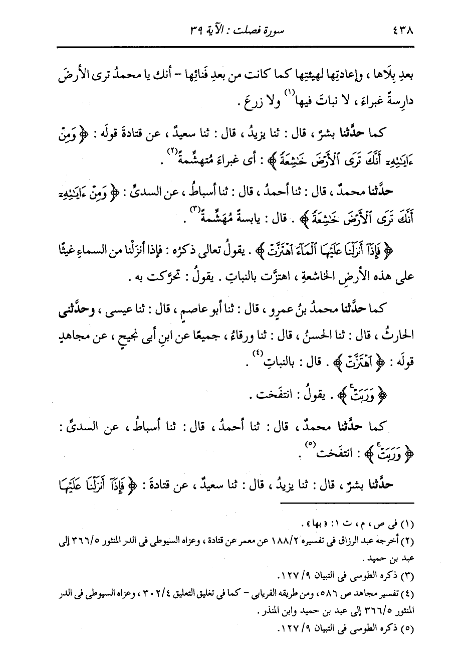 حَدَّثَنَا مُحَمَّدٌ، قَالَ: ثنا أَحْمَدُ، قَالَ: ثنا أَسْبَاطٌ، عَنِ السُّدِّيِّ، {§وَمِنْ آيَاتِهِ أَنَّكَ تَرَى الْأَرْضَ خَاشِعَةً} [فصلت: 39] قَالَ: «يَابِسَةً مُتَهَمِّشَةً» {فَإِذَا أَنْزَلْنَا عَلَيْهَا الْمَاءَ اهْتَزَّتْ} [الحج: 5] يَقُولُ تَعَالَى ذِكْرُهُ: فَإِذَا أَنْزَلْنَا مِنَ السَّمَاءِ غَيْثًا عَلَى هَذِهِ الْأَرْضِ الْخَاشِعَةِ اهْتَزَّتْ بِالنَّبَاتِ. يَقُولُ: تَحَرَّكَتْ بِهِ
