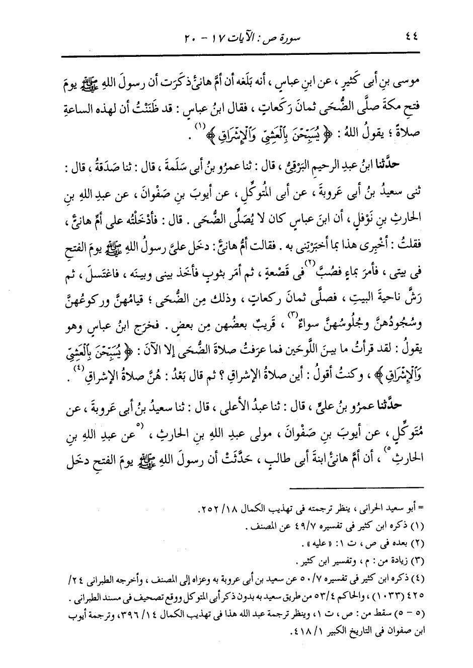 حَدَّثَنَا ابْنُ عَبْدِ الرَّحِيمِ الْبَرْقِيُّ، قَالَ: ثنا عَمْرُو بْنُ أَبِي سَلَمَةَ، قَالَ: ثنا صَدَقَةُ، قَالَ: ثني سَعِيدُ بْنُ أَبِي عَرُوبَةَ، عَنْ أَبِي الْمُتَوَكِّلِ، عَنْ أَيُّوبَ بْنِ صَفْوَانَ، عَنْ عَبْدِ اللَّهِ بْنِ الْحَارِثِ بْنِ نَوْفَلٍ، أَنَّ ابْنَ عَبَّاسٍ، كَانَ لَا يُصَلِّي الضُّحَى، قَالَ: فَأَدْخَلْتُهُ عَلَى أُمِّ هَانِئٍ، فَقُلْتُ: اخْبِرِي هَذَا بِمَا أَخْبَرْتِنِي بِهِ، فَقَالَتْ أُمُّ هَانِئٍ: " §دَخَلَ عَلَيَّ رَسُولُ اللَّهِ صَلَّى اللهُ عَلَيْهِ وَسَلَّمَ يَوْمَ الْفَتْحِ فِي بَيْتِي، فَأَمَرَ بِمَاءٍ فَصَبَّ فِي قَصعَةٍ، ثُمَّ أَمَرَ بِثَوْبٍ فَأَخَذَ بَيْنِي وَبَيْنَهُ، فَاغْتَسَلَ، ثُمَّ رَشَّ نَاحِيَةَ الْبَيْتِ فَصَلَّى ثَمَانَ رَكَعَاتٍ، وَذَلِكَ مِنَ الضُّحَى قِيَامُهُنَّ وَرُكُوعُهُنَّ وَسُجُودُهُنَّ وَجُلُوسُهُنَّ سَوَاءٌ، قَرِيبٌ بَعْضُهُنَّ مِنْ بَعْضٍ، فَخَرَجَ ابْنُ عَبَّاسٍ، وَهُوَ يَقُولُ: لَقَدْ قَرَأْتِ مَا بَيْنَ اللَّوْحَيْنِ، مَا عَرَفْتُ صَلَاةَ الضُّحَى إِلَّا الْآنَ {يُسَبِّحْنَ بِالْعَشِيِّ وَالْإِشْرَاقِ} [ص: 18] وَكُنْتُ أَقُولُ: أَيْنَ صَلَاةُ الْإِشْرَاقِ، ثُمَّ قَالَ: بَعْدَهُنَّ صَلَاةُ الْإِشْرَاقِ " حَدَّثَنَا عَمْرُو بْنُ عَلِيٍّ، قَالَ: ثنا عَبْدُ الْأَعْلَى، قَالَ: ثنا سَعِيدُ بْنُ أَبِي عَرُوبَةَ، عَنْ مُتَوَكِّلٍ، عَنْ أَيُّوبَ بْنِ صَفْوَانَ، مَوْلَى عَبْدِ اللَّهِ بْنِ الْحَارِثِ، عَنْ عَبْدِ اللَّهِ بْنِ الْحَارِثِ أَنَّ أُمَّ هَانِئٍ ابْنَةَ أَبِي طَالِبٍ حَدَّثَتْ أَنَّ رَسُولَ اللَّهِ صَلَّى اللهُ عَلَيْهِ وَسَلَّمَ يَوْمَ الْفَتْحِ دَخَلَ -[45]- عَلَيْهَا ثُمَّ ذَكَرَ نَحْوَهُ وَعَنِ ابْنِ عَبَّاسٍ فِي قَوْلِهِ: {يُسَبِّحْنَ بِالْعَشِيِّ} [ص: 18] مِثْلُ ذَلِكَ