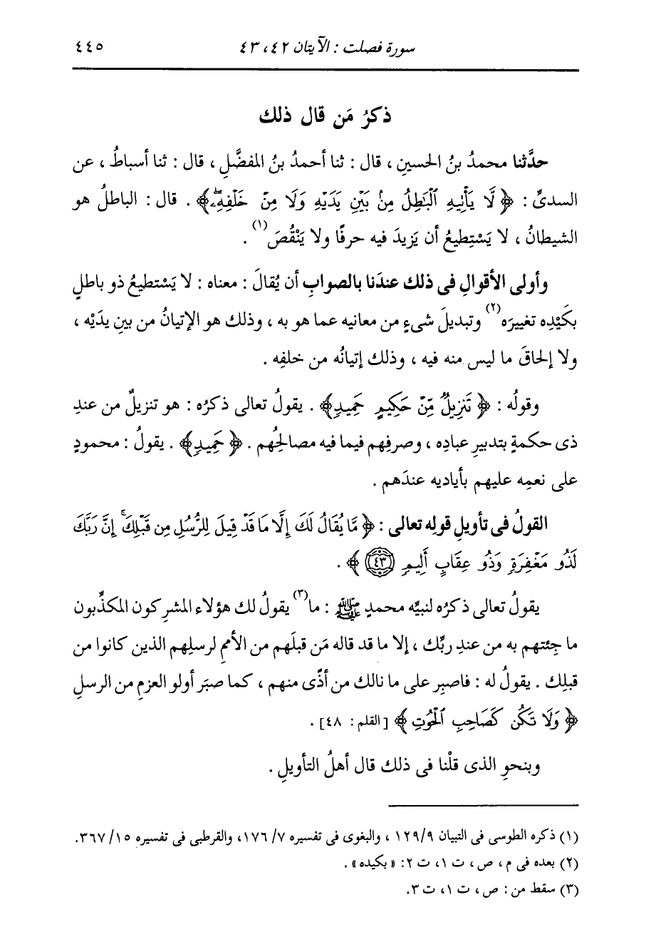 ذِكْرُ مَنْ قَالَ ذَلِكَ: حَدَّثَنَا مُحَمَّدُ بْنُ الْحُسَيْنِ، قَالَ: ثنا أَحْمَدُ بْنُ الْمُفَضَّلِ، قَالَ: ثنا أَسْبَاطٌ، عَنِ السُّدِّيِّ، {§لَا يَأْتِيهِ الْبَاطِلُ مِنْ بَيْنِ يَدَيْهِ وَلَا مِنْ خَلْفِهِ} [فصلت: 42] قَالَ: " الْبَاطِلُ: هُوَ الشَّيْطَانُ لَا يَسْتَطِيعُ أَنْ يُزِيدَ فِيهِ حَرْفًا وَلَا يُنْقِصَ " وَأَوْلَى الْأَقْوَالِ فِي ذَلِكَ عِنْدَنَا بِالصَّوَابِ أَنْ يُقَالَ: مَعْنَاهُ: لَا يَسْتَطِيعُ ذُو بَاطِلٍ بِكَيْدِهِ تَغْيِيرَهُ بِكَيْدِهِ، وَتَبْدِيلَ شَيْءٍ مِنْ مَعَانِيهِ عَمَّا هُوَ بِهِ، وَذَلِكَ هُوَ الْإِتْيَانُ مِنْ بَيْنِ يَدَيْهِ، وَلَا إِلْحَاقَ مَا لَيْسَ مِنْهُ فِيهِ، وَذَلِكَ إِتْيَانُهُ مِنْ خَلْفِهِ