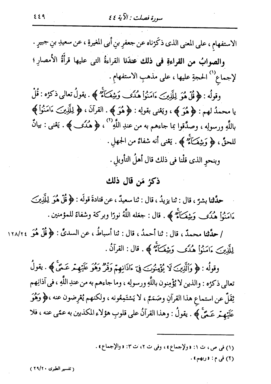 §وَقَوْلُهُ: {قُلْ هُوَ لِلَّذِينَ آمَنُوا هُدًى وَشِفَاءً} [فصلت: 44] يَقُولُ تَعَالَى ذِكْرُهُ: قُلْ يَا مُحَمَّدُ لَهُمْ: هُوَ، وَيَعْنِي بِقَوْلِهِ {هُوَ} [البقرة: 29] الْقُرْآنَ {لِلَّذِينَ آمَنُوا} [المائدة: 82] بِاللَّهِ وَرَسُولِهِ، وَصَدَّقُوا بِمَا جَاءَهُمْ بِهِ مِنْ عِنْدِ رَبِّهِمْ {هُدًى} [البقرة: 2] يَعْنِي بَيَانٌ لِلْحَقِّ {وَشِفَاءٌ} [يونس: 57] يَعْنِي أَنَّهُ شِفَاءٌ مِنَ الْجَهْلِ وَبِنَحْوِ الَّذِي قُلْنَا فِي ذَلِكَ قَالَ أَهْلُ التَّأْوِيلِ