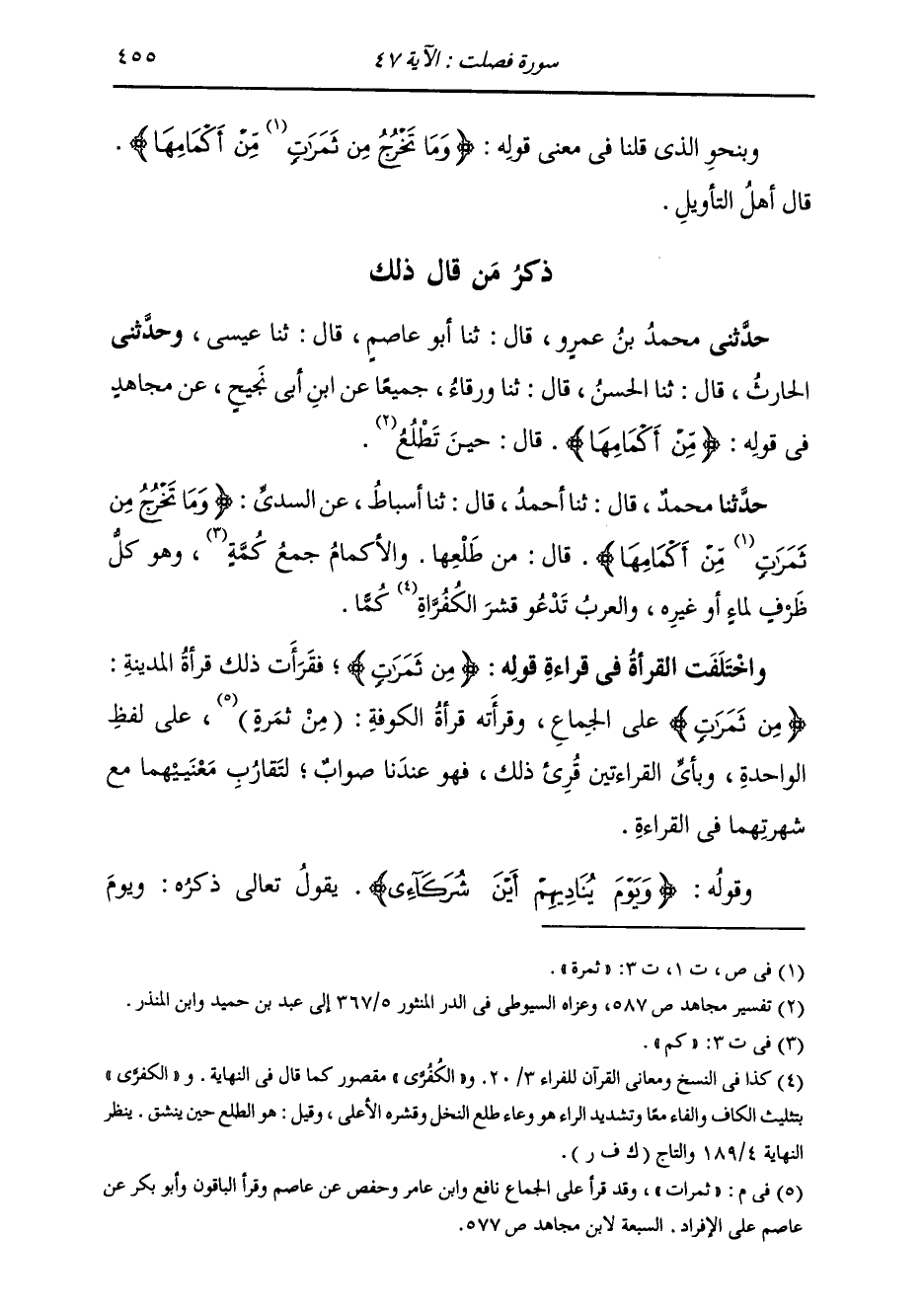 حَدَّثَنَا مُحَمَّدٌ قَالَ: ثَنَا أَحْمَدُ قَالَ: ثَنَا أَسْبَاطٌ، عَنِ السُّدِّيِّ، {§وَمَا تَخْرُجُ مِنْ ثَمَرَاتٍ مِنْ أَكْمَامِهَا} [فصلت: 47] قَالَ: «مِنْ طَلْعِهَا، وَالْأَكْمَامُ جَمْعُ كُمَّةٍ، وَهُوَ كُلُّ ظَرْفٍ لِمَاءٍ أَوْ غَيْرِهِ، وَالْعَرَبُ تَدْعُو قِشْرَ الْكُفُرَّاةِ كُمًّا» وَاخْتَلَفَتِ الْقُرَّاءُ فِي قِرَاءَةِ قَوْلِهِ: {مِنْ ثَمَرَاتٍ} [فصلت: 47] فَقَرَأَتْ ذَلِكَ قُرَّاءُ الْمَدِينَةِ: {مِنْ ثَمَرَاتٍ} [فصلت: 47] عَلَى الْجِمَاعِ، وَقَرَأَتْ قُرَّاءُ الْكُوفَةِ: (مِنْ ثَمَرَةٍ) عَلَى لَفْظِ الْوَاحِدَةِ، وَبِأَيِّ الْقِرَاءَتَيْنِ قُرِئَ ذَلِكَ فَهُوَ عِنْدَنَا صَوَابٌ لِتَقَارُبِ مَعْنَيَيْهِمَا مَعَ شُهْرَتِهِمَا فِي الْقِرَاءَةِ
