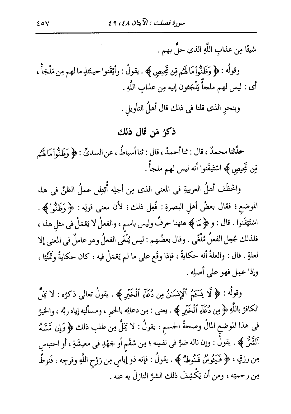 ذِكْرُ مَنْ قَالَ ذَلِكَ: حَدَّثَنَا مُحَمَّدٌ قَالَ: ثَنَا أَحْمَدُ قَالَ: ثَنَا أَسْبَاطٌ، عَنِ السُّدِّيِّ، " {§وَظَنُّوا مَا لَهُمْ مِنْ مَحِيصِ} [فصلت: 48] اسْتَيْقَنُوا أَنَّهُ لَيْسَ لَهُمْ مَلْجَأٌ " وَاخْتَلَفَ أَهْلُ الْعَرَبِيَّةِ فِي الْمَعْنَى الَّذِي مِنْ أَجَلِهِ أُبْطِلَ عَمَلُ الظَّنِّ فِي هَذَا الْمَوْضِعِ، فَقَالَ بَعْضُ أَهْلِ الْبَصْرَةِ فَعَلَ ذَلِكَ لِأَنَّ مَعْنَى قَوْلِهِ: {وَظَنُّوا} [فصلت: 48] اسْتَيْقَنُوا قَالَ: وَ {مَا} [فصلت: 48] هَاهُنَا حَرْفٌ وَلَيْسَ بِاسْمٍ، وَالْفِعْلُ لَا يَعْمَلُ فِي مِثْلِ هَذَا، فَلِذَلِكَ جُعِلَ الْفِعْلُ مُلْغًى وَقَالَ بَعْضُهُمْ: لَيْسَ يُلْغَى الْفِعْلُ وَهُوَ عَامِلٌ فِي الْمَعْنَى إِلَّا لِعِلَّةٍ قَالَ: وَالْعِلَّةُ أَنَّهُ حِكَايَةٌ، فَإِذَا وَقَعَ عَلَى مَا لَمْ يَعْمَلْ فِيهِ كَانَ حِكَايَةً وَتَمَنِّيًا، وَإِذَا عَمِلَ فَهُوَ عَلَى أَصْلِهِ