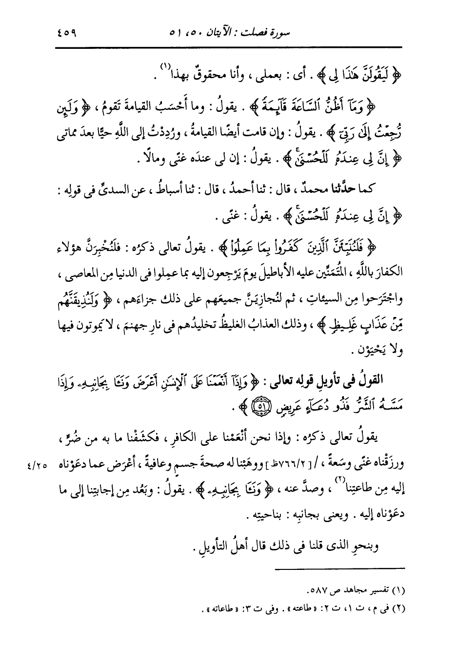كَمَا: حَدَّثَنَا مُحَمَّدٌ قَالَ: ثَنَا أَحْمَدُ قَالَ: ثَنَا أَسْبَاطٌ، عَنِ السُّدِّيِّ، فِي قَوْلِهِ: {§إِنَّ لِي عِنْدَهُ لَلْحُسْنَى} [فصلت: 50] يَقُولُ: «غِنًى» {فَلَنُنَبِّئَنَّ الَّذِينَ كَفَرُوا بِمَا عَمِلُوا} [فصلت: 50] يَقُولُ تَعَالَى ذِكْرُهُ: " فَلَنُخْبِرَنَّ هَؤُلَاءِ الْكُفَّارَ بِاللَّهِ، الْمُتَمَنِّينَ عَلَيْهِ الْأَبَاطِيلَ يَوْمَ يُرْجَعُونَ إِلَيْهِ بِمَا عَمِلُوا فِي الدُّنْيَا مِنَ الْمَعَاصِي، وَاجْتَرَحُوا مِنَ السَّيِّئَاتِ، ثُمَّ لَنُجَازِيَنَّ جَمِيعَهُمْ عَلَى ذَلِكَ جَزَاءَهُمْ {وَلَنُذِيقَنَّهُمْ مِّنْ عَذَابٍ غَلِيظٍ} [فصلت: 50] وَذَلِكَ الْعَذَابُ الْغَلِيظُ تَخْلِيدُهُمْ فِي نَارِ جَهَنَّمَ، لَا يَمُوتُونَ فِيهَا وَلَا يَحْيَوْنَ "