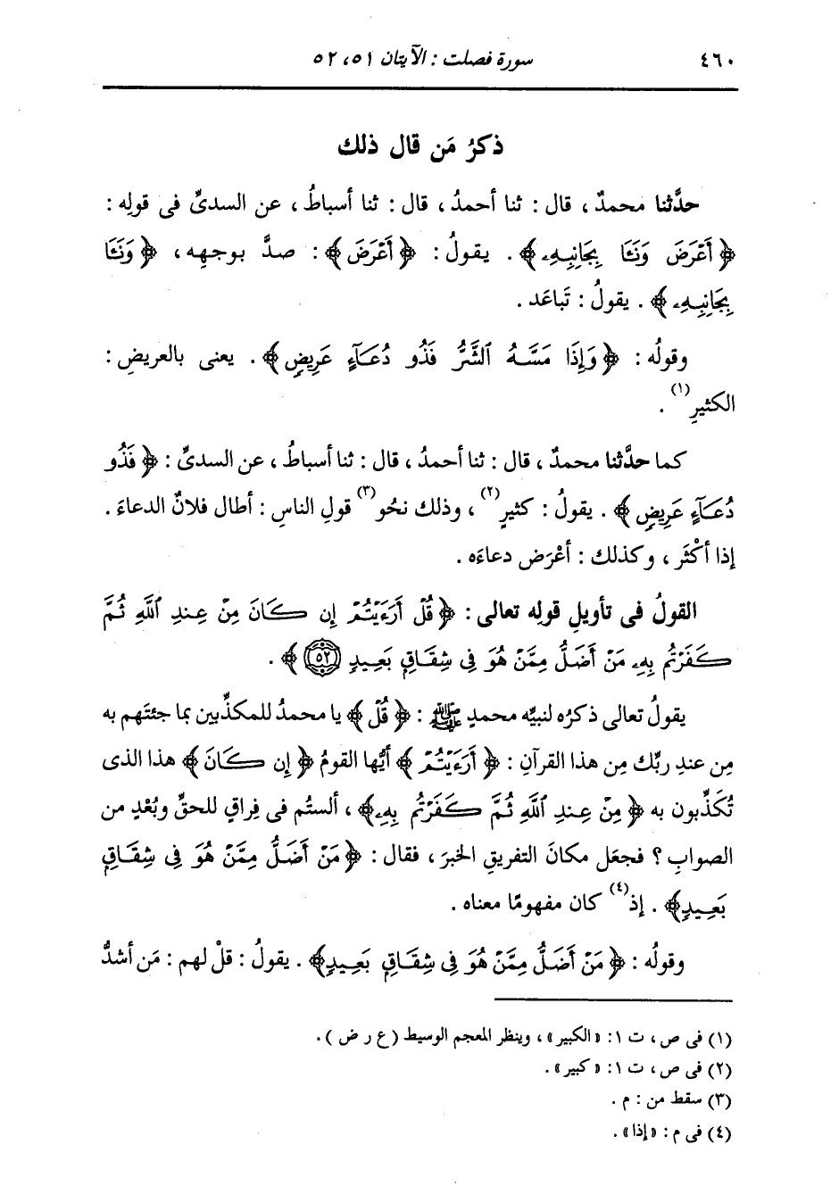 ذِكْرُ مَنْ قَالَ ذَلِكَ حَدَّثَنَا مُحَمَّدٌ قَالَ: ثَنَا أَحْمَدُ قَالَ: ثَنَا أَسْبَاطٌ، عَنِ السُّدِّيِّ، فِي قَوْلِهِ: {أَعْرَضَ وَنَأَى بِجَانِبِهِ} [الإسراء: 83] يَقُولُ: " §أَعْرَضَ: صَدَّ بِوَجْهِهِ، وَنَأَى بِجَانِبِهِ: يَقُولُ: تَبَاعَدَ "