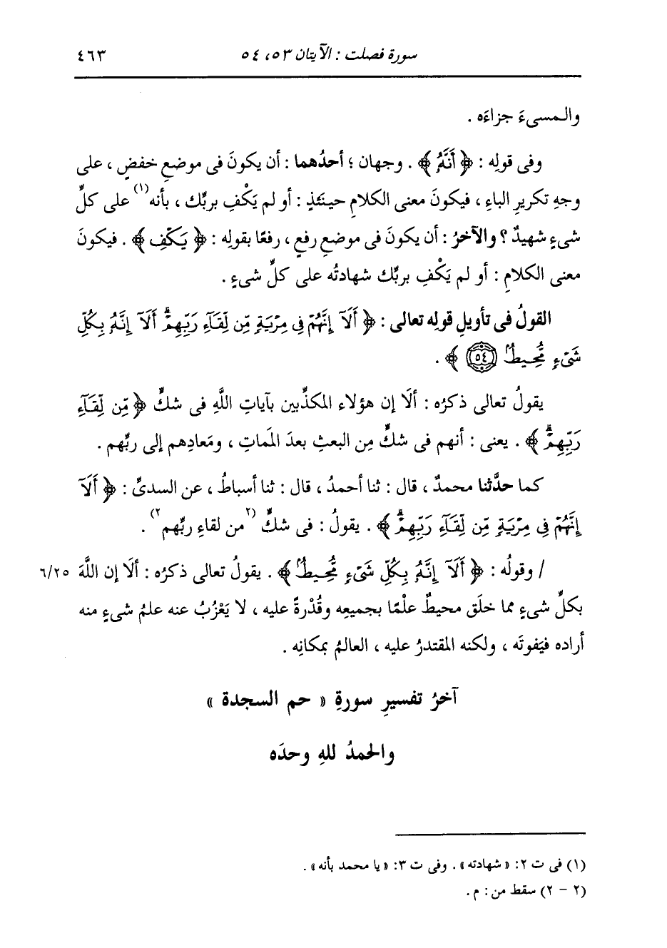§الْقَوْلُ فِي تَأْوِيلِ قَوْلِهِ تَعَالَى: {أَلَا إِنَّهُمْ فِي مِرْيَةٍ مِنْ لِقَاءِ رَبِّهِمْ أَلَا إِنَّهُ بِكُلِّ شَيْءٍ مُّحِيطٌ} [فصلت: 54] يَقُولُ تَعَالَى ذِكْرُهُ: أَلَا إِنَّ هَؤُلَاءِ الْمُكَذِّبِينَ بِآيَاتِ اللَّهِ فِي شَكٍّ مِنْ لِقَاءِ رَبِّهِمْ، يَعْنِي أَنَّهُمْ فِي شَكٍّ مِنَ الْبَعْثِ بَعْدَ الْمَمَاتِ، وَمَعَادِهِمْ إِلَى رَبِّهِمْ