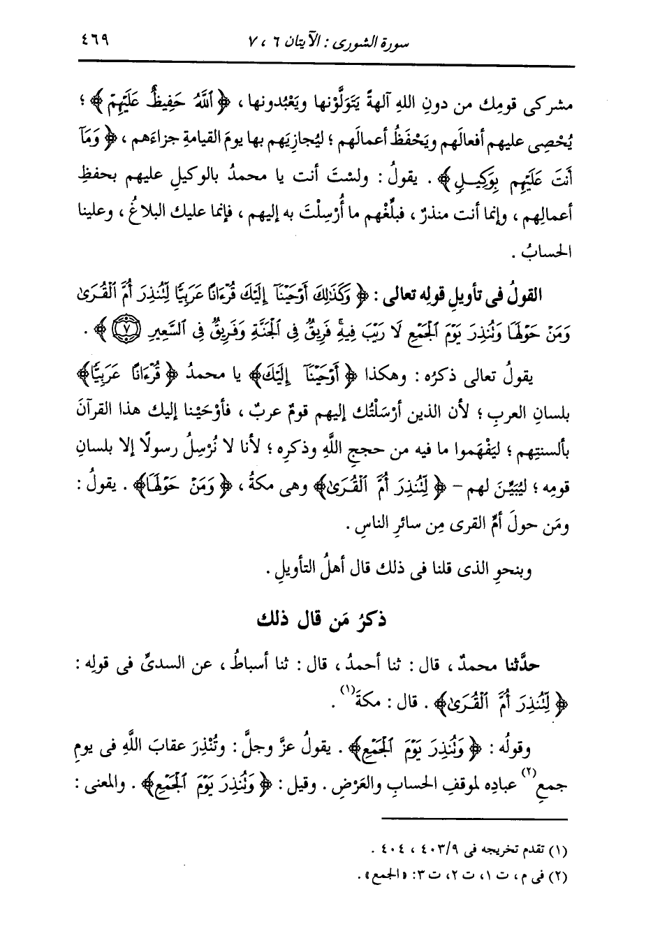 §الْقَوْلُ فِي تَأْوِيلِ قَوْلِهِ تَعَالَى: {وَكَذَلِكَ أَوْحَيْنَا إِلَيْكَ قُرْآنًا عَرَبِيًّا لِتُنْذِرَ أُمَّ الْقُرَى وَمَنْ حَوْلَهَا وَتُنْذِرَ يَوْمَ الْجَمْعِ لَا رَيْبَ فِيهِ فَرِيقٌ فِي الْجَنَّةِ وَفَرِيقٌ فِي السَّعِيرِ} [الشورى: 7] يَقُولُ تَعَالَى ذِكْرُهُ: وَهَكَذَا {أَوْحَيْنَا إِلَيْكَ} [النساء: 163] يَا مُحَمَّدُ {قُرْآنًا عَرَبِيًّا} [يوسف: 2] بِلِسَانِ الْعَرَبِ، لِأَنَّ الَّذِينَ أَرْسَلْتُكَ إِلَيْهِمْ قَوْمٌ عَرَبٌ، فَأَوْحَيْنَا إِلَيْكَ هَذَا الْقُرْآنَ بِأَلْسِنَتِهِمْ، لِيَفْهَمُوا مَا فِيهِ مِنْ حُجَجِ اللَّهِ وَذِكْرِهِ، لَأَنَّا لَا نُرْسِلُ رَسُولًا إِلَّا بِلِسَانِ قَوْمِهِ لِيُبَيِّنَ لَهُمْ {لِتُنْذِرَ أُمَّ الْقُرَى} [الشورى: 7] وَهِيَ مَكَّةُ {وَمَنْ حَوْلَهَا} [الأنعام: 92] يَقُولُ: وَمَنْ حَوْلَ أُمِّ الْقُرَى مِنْ سَائِرِ النَّاسِ وَبِنَحْوِ الَّذِي قُلْنَا فِي ذَلِكَ قَالَ أَهْلُ التَّأْوِيلِ