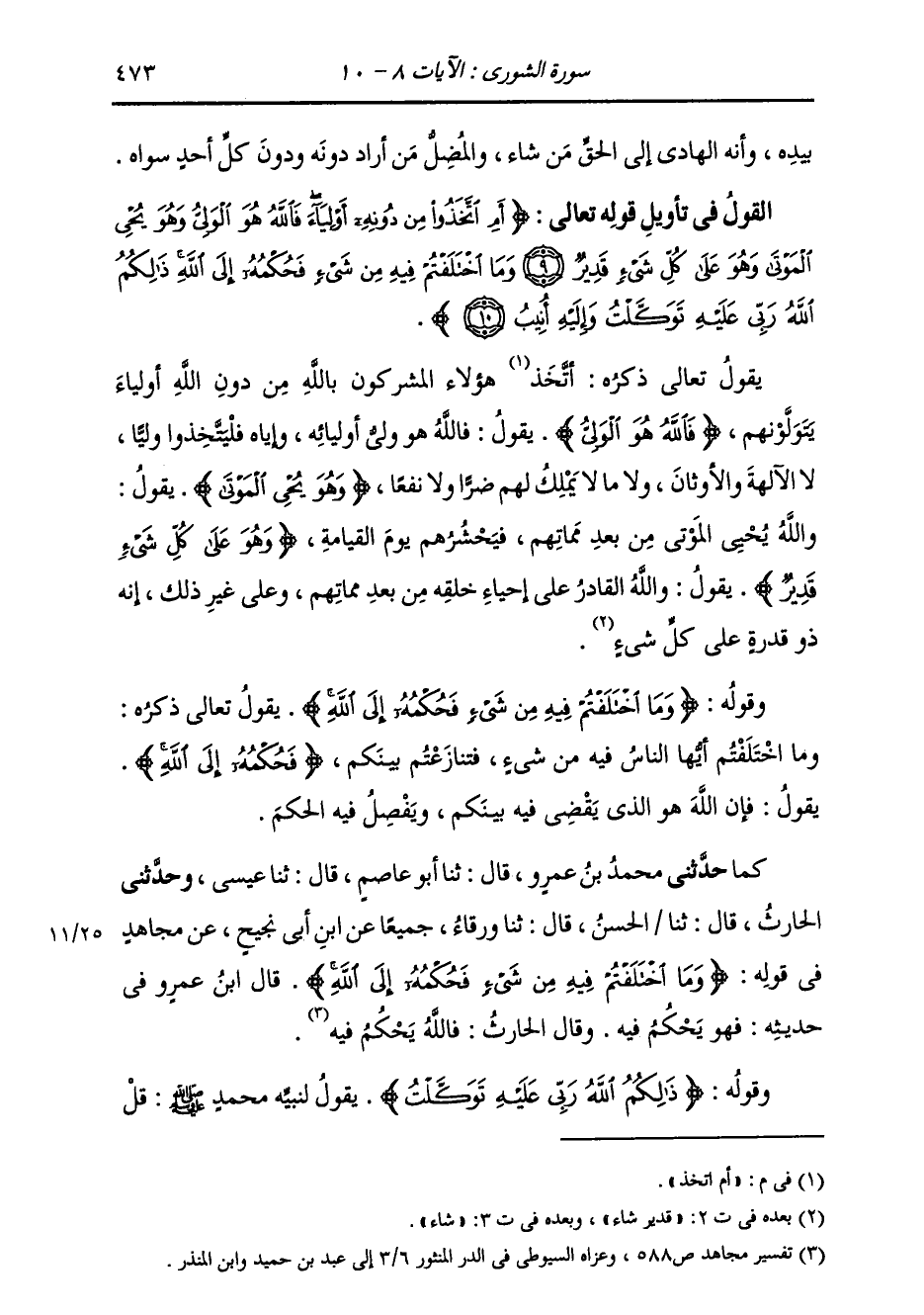 كَمَا: حَدَّثَنِي مُحَمَّدُ بْنُ عَمْرٍو قَالَ: ثَنَا أَبُو عَاصِمٍ قَالَ: ثَنَا عِيسَى، وَحَدَّثَنِي الْحَارِثُ قَالَ: ثَنَا الْحَسَنُ قَالَ: ثَنَا وَرْقَاءُ، جَمِيعًا، عَنِ ابْنِ أَبِي نَجِيحٍ، عَنْ مُجَاهِدٍ، فِي قَوْلِهِ: {§وَمَا اخْتَلَفْتُمْ فِيهِ مِنْ شَيْءٍ فَحُكْمُهُ إِلَى اللَّهِ} [الشورى: 10] قَالَ ابْنُ عَمْرٍو فِي حَدِيثِهِ: «فَهُوَ يَحْكُمُ فِيهِ» ، وَقَالَ الْحَارِثُ: «فَاللَّهُ يَحْكُمُ فِيهِ»