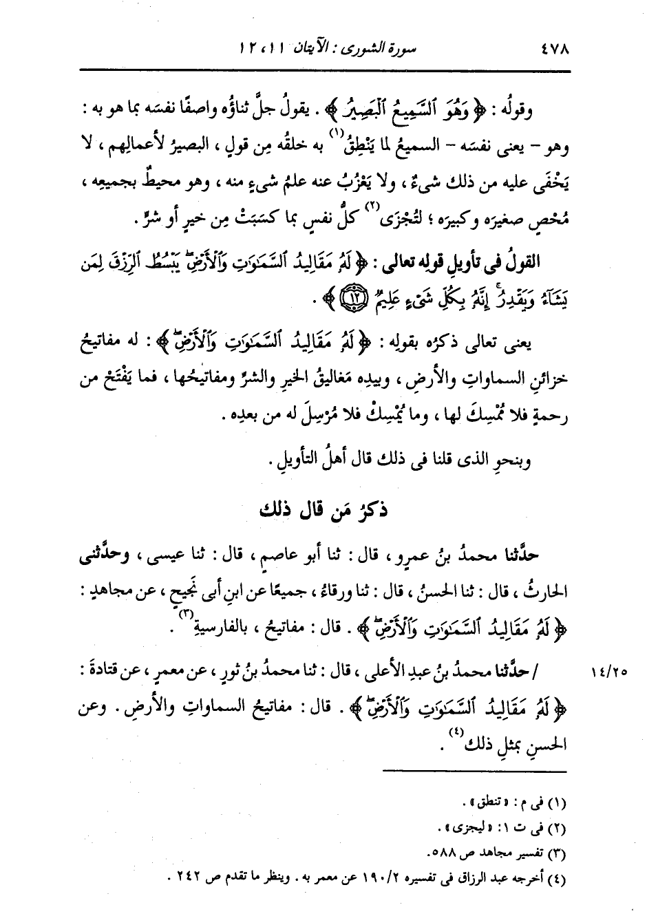 ذِكْرُ مَنْ قَالَ ذَلِكَ: حَدَّثَنَا مُحَمَّدُ بْنُ عَمْرٍو قَالَ: ثَنَا أَبُو عَاصِمٍ قَالَ: ثَنَا عِيسَى، وَحَدَّثَنِي الْحَارِثُ قَالَ: ثَنَا الْحَسَنُ قَالَ: ثَنَا وَرْقَاءُ، جَمِيعًا، عَنِ ابْنِ أَبِي نَجِيحٍ، عَنْ مُجَاهِدٍ، {§لَهُ مَقَالِيدُ السَّمَوَاتِ وَالْأَرْضِ} قَالَ: «مَفَاتِيحُ بِالْفَارِسِيَّةِ»