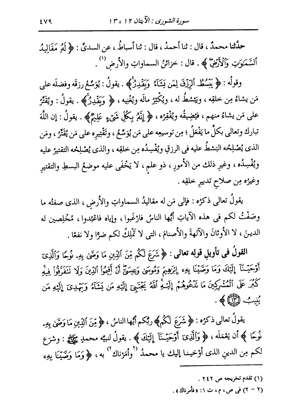 §الْقَوْلُ فِي تَأْوِيلِ قَوْلِهِ تَعَالَى: {شَرَعَ لَكُمْ مِنَ الدِّينِ مَا وَصَّى بِهِ نُوحًا وَالَّذِي أَوْحَيْنَا إِلَيْكَ وَمَا وَصَّيْنَا بِهِ إِبْرَاهِيمَ وَمُوسَى وَعِيسَى أَنْ أَقِيمُوا الدِّينَ وَلَا تَتَفَرَّقُوا فِيهِ كَبُرَ عَلَى الْمُشْرِكِينَ مَا تَدْعُوهُمْ إِلَيْهِ اللَّهُ يَجْتَبِي إِلَيْهِ مَنْ يَشَاءُ وَيَهْدِي إِلَيْهِ مَنْ يُنِيبُ} [الشورى: 13] يَقُولُ تَعَالَى ذِكْرُهُ: {شَرَعَ لَكُمْ} [الشورى: 13] رَبُّكُمْ أَيُّهَا النَّاسُ {مِنَ الدِّينِ مَا وَصَّى بِهِ نُوحًا} [الشورى: 13] أَنْ يَعْمَلَهُ {وَالَّذِي أَوْحَيْنَا إِلَيْكَ} [فاطر: 31] يَقُولُ لِنَبِيِّهِ مُحَمَّدٍ صَلَّى اللهُ عَلَيْهِ وَسَلَّمَ: وَشَرَعَ لَكُمْ مِنَ الدِّينِ الَّذِي أَوْحَيْنَا إِلَيْكَ يَا مُحَمَّدُ، فَأَمَرْنَاكَ بِهِ {وَمَا وَصَّيْنَا بِهِ