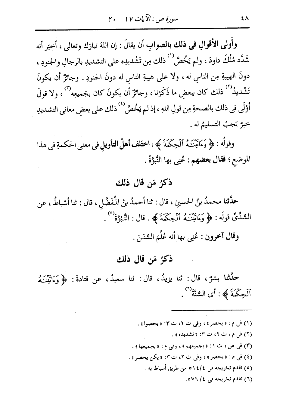 ذِكْرُ مَنْ قَالَ ذَلِكَ: حَدَّثَنَا مُحَمَّدُ بْنُ الْحُسَيْنِ، قَالَ: ثنا أَحْمَدُ بْنُ الْمُفَضَّلِ، قَالَ: ثنا أَسْبَاطٌ، عَنِ السُّدِّيِّ، قَوْلُهُ: {§وَآتَيْنَاهُ الْحِكْمَةَ} [ص: 20] قَالَ: «النُّبُوَّةَ» وَقَالَ آخَرُونَ: عُنِيَ بِهَا أَنَّهُ عَلِمَ السُّنَنَ