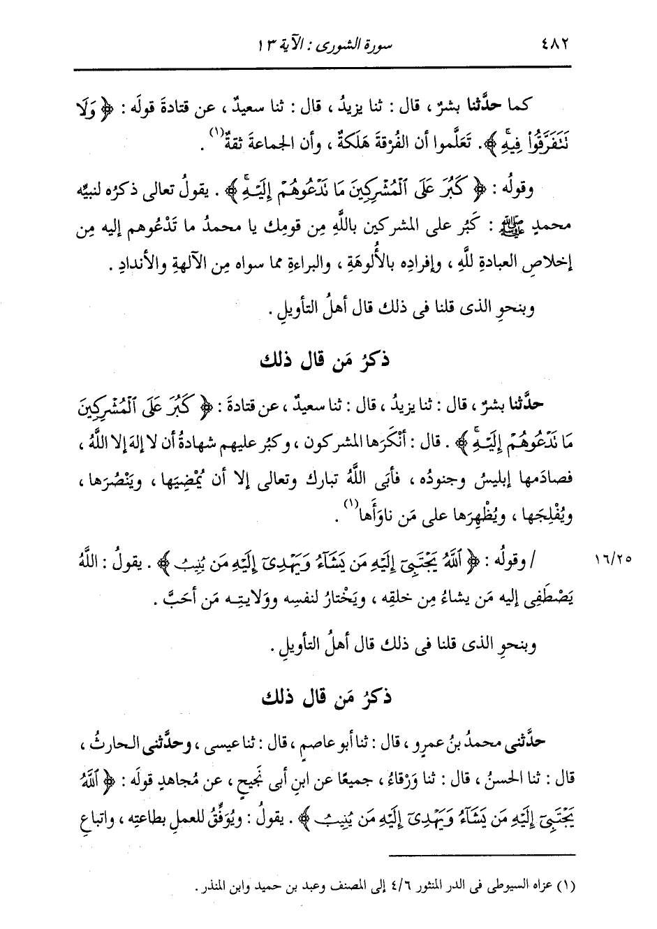 ذِكْرُ مَنْ قَالَ ذَلِكَ: حَدَّثَنَا بِشْرٌ قَالَ: ثَنَا يَزِيدُ قَالَ: ثَنَا سَعِيدٌ، عَنْ قَتَادَةَ {§كَبُرَ عَلَى الْمُشْرِكِينَ مَا تَدْعُوهُمْ إِلَيْهِ} [الشورى: 13] قَالَ: «أَنْكَرَهَا الْمُشْرِكُونِ، وَكَبُرَ عَلَيْهِمْ شَهَادَةُ أَنْ لَا إِلَهَ إِلَّا اللَّهُ، فَصَادَمَهَا إِبْلِيسُ وَجُنُودُهُ، فَأَبَى اللَّهُ تَبَارَكَ وَتَعَالَى إِلَّا أَنْ يُمْضِيَهَا وَيَنْصُرَهَا وَيُفْلِجَهَا وَيُظْهِرَهَا عَلَى مَنْ نَاوَأَهَا»