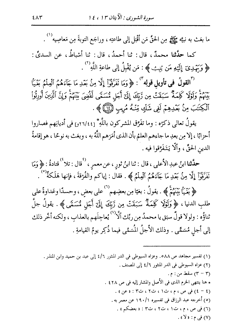 {§بَغْيًا بَيْنَهُمْ} [البقرة: 213] يَقُولُ: بَغْيًا مِنْ بَعْضِكُمْ عَلَى بَعْضٍ وَحَسَدًا وَعَدَاوَةً عَلَى طَلَبِ الدُّنْيَا {وَلَوْلَا كَلِمَةٌ سَبَقَتْ مِنْ رَّبِّكَ إِلَى أَجَلٍ مُّسَمًّى} [الشورى: 14] يَقُولُ جَلَّ ثَنَاؤُهُ: وَلَوْلَا قَوْلٌ سَبَقَ يَا مُحَمَّدُ مِنْ رَبِّكَ لَا يُعَاجِلُهُمْ بِالْعَذَابِ، وَلَكِنَّهُ أَخَّرَ ذَلِكَ إِلَى أَجَلٍ مُسَمًّى، وَذَلِكَ الْأَجَلُ الْمُسَمَّى فِيمَا ذُكِرَ: يَوْمُ الْقِيَامَةِ