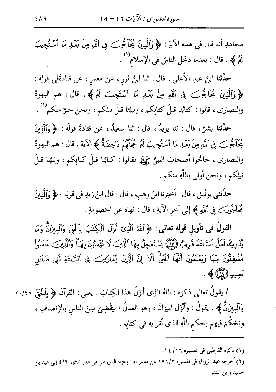 حَدَّثَنَا ابْنُ عَبْدِ الْأَعْلَى قَالَ: ثَنَا ابْنُ ثَوْرٍ، عَنْ مَعْمَرٍ، عَنْ قَتَادَةَ، {§وَالَّذِينَ يُحَاجُّونَ فِي اللَّهِ مِنْ بَعْدِ مَا اسْتُجِيبَ لَهُ حُجَّتُهُمْ دَاحِضَةٌ عِنْدَ رَبِّهِمْ} [الشورى: 16] قَالَ: " هُمُ الْيَهُودُ وَالنَّصَارَى، قَالُوا: كِتَابُنَا قَبْلَ كِتَابِكُمْ، وَنَبِيُّنا قَبْلَ نَبِيِّكُمْ، وَنَحْنُ خَيْرٌ مِنْكُمْ "