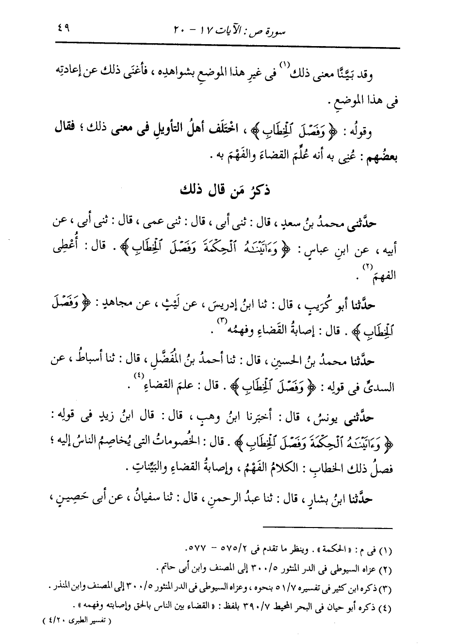 §وَقَوْلُهُ: {وَفَصْلَ الْخِطَابِ} [ص: 20] اخْتَلَفَ أَهْلُ التَّأْوِيلِ فِي مَعْنَى ذَلِكَ، فَقَالَ بَعْضُهُمْ: عُنِيَ بِهِ أَنَّهُ عَلِمَ الْقَضَاءَ وَالْفَهْمَ بِهِ