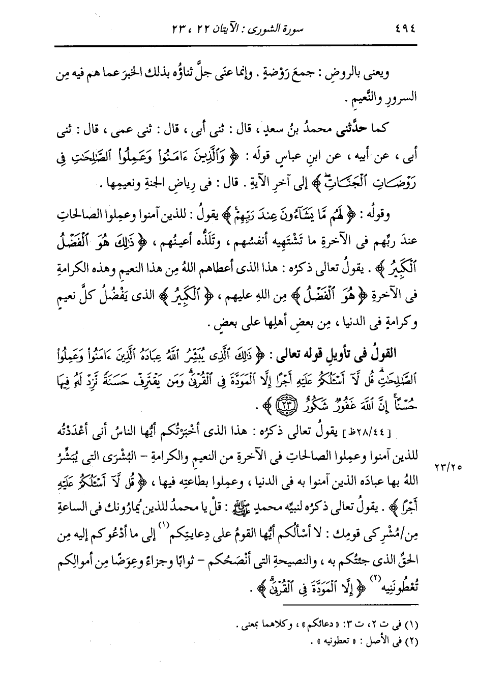 §الْقَوْلُ فِي تَأْوِيلِ قَوْلِهِ تَعَالَى: {ذَلِكَ الَّذِي يُبَشِّرُ اللَّهُ عِبَادَهُ الَّذِينَ آمَنُوا وَعَمِلُوا الصَّالِحَاتِ قُلْ لَا أَسْأَلُكُمْ عَلَيْهِ أَجْرًا إِلَّا الْمَوَدَّةَ فِي الْقُرْبَى وَمَنْ يَقْتَرِفْ حَسَنَةً نَزِدْ لَهُ فِيهَا حُسْنًا إِنَّ اللَّهَ غَفُورٌ شَكُورٌ} [الشورى: 23] يَقُولُ تَعَالَى ذِكْرُهُ: هَذَا الَّذِي أَخْبَرْتُكُمْ أَيُّهَا النَّاسُ أَنِّي أَعْدَدْتُهُ لِلَّذِينَ آمَنُوا وَعَمِلُوا الصَّالِحَاتِ فِي الْآخِرَةِ مِنَ النَّعِيمِ وَالْكَرَامَةِ، الْبُشْرَى الَّتِي يُبَشِّرُ اللَّهُ عِبَادَهُ الَّذِينَ آمَنُوا بِهِ فِي الدُّنْيَا، وَعَمِلُوا بِطَاعَتِهِ فِيهَا {قُلْ لَا أَسْأَلُكُمْ عَلَيْهِ أَجْرًا} [الأنعام: 90] يَقُولُ تَعَالَى ذِكْرُهُ لِنَبِيِّهِ مُحَمَّدٍ صَلَّى اللهُ عَلَيْهِ وَسَلَّمَ: قُلْ يَا مُحَمَّدُ لِلَّذِينَ يُمَارُونَكَ فِي السَّاعَةِ مِنْ مُشْرِكِي قَوْمِكَ: لَا أَسْأَلُكُمْ أَيُّهَا الْقَوْمُ عَلَى دَعَايَتِكُمْ إِلَى مَا أَدْعُوكُمْ إِلَيْهِ مِنَ الْحَقِّ الَّذِي جِئْتُكُمْ بِهِ وَالنَّصِيحَةِ الَّتِي أَنْصَحُكُمْ ثَوَابًا وَجَزَاءً وَعِوَضًا مِنْ أَمْوَالِكُمْ تُعْطُونَنِيهِ {إِلَّا الْمَوَدَّةَ فِي الْقُرْبَى} [الشورى: 23]