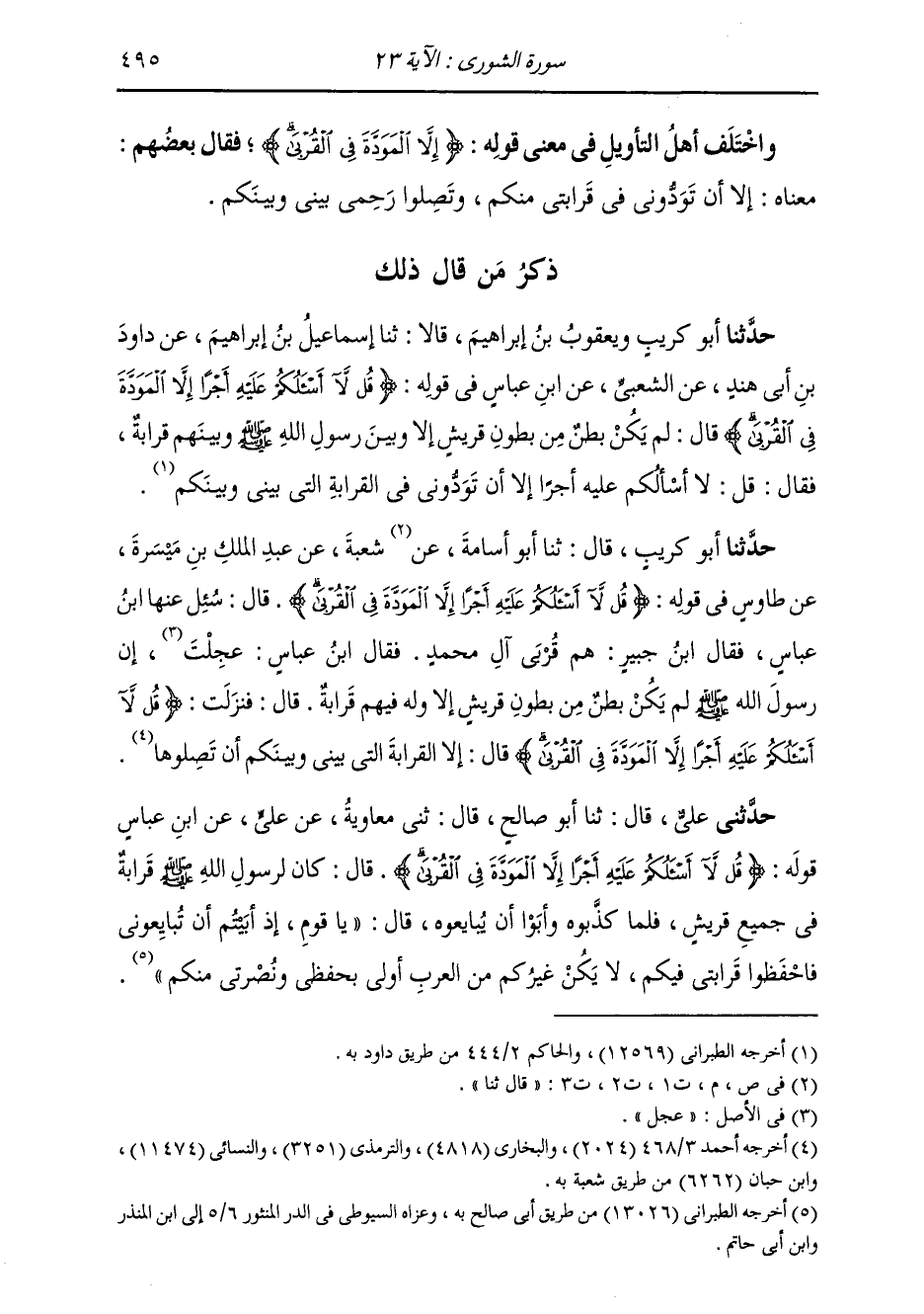 حَدَّثَنَا أَبُو كُرَيْبٍ قَالَ: ثَنَا أَبُو أُسَامَةَ قَالَ: ثَنَا شُعْبَةُ، عَنْ عَبْدِ الْمَلِكِ بْنِ مَيْسَرَةَ، عَنْ طَاوُسٍ، فِي قَوْلِهِ: {§قُلْ لَا أَسْأَلُكُمْ عَلَيْهِ أَجْرًا إِلَّا الْمَوَدَّةَ فِي الْقُرْبَى} [الشورى: 23] قَالَ: سُئِلَ عَنْهَا ابْنُ عَبَّاسٍ، فَقَالَ ابْنُ جُبَيْرٍ: هُمْ قُرْبَى آلِ مُحَمَّدٍ، فَقَالَ ابْنُ عَبَّاسٍ: عَجِلْتَ، إِنَّ رَسُولَ اللَّهِ صَلَّى اللهُ عَلَيْهِ وَسَلَّمَ لَمْ يَكُنْ بَطْنٌ مِنْ بُطُونِ قُرَيْشٍ إِلَّا وَلَهُ فِيهِمْ قَرَابَةٌ قَالَ: فَنَزَلَتْ {قُلْ لَا أَسْأَلُكُمْ عَلَيْهِ أَجْرًا إِلَّا الْمَوَدَّةَ فِي الْقُرْبَى} [الشورى: 23] قَالَ: «إِلَّا الْقَرَابَةُ الَّتِي بَيْنِي وَبَيْنَكُمْ أَنْ تَصِلُوهَا»