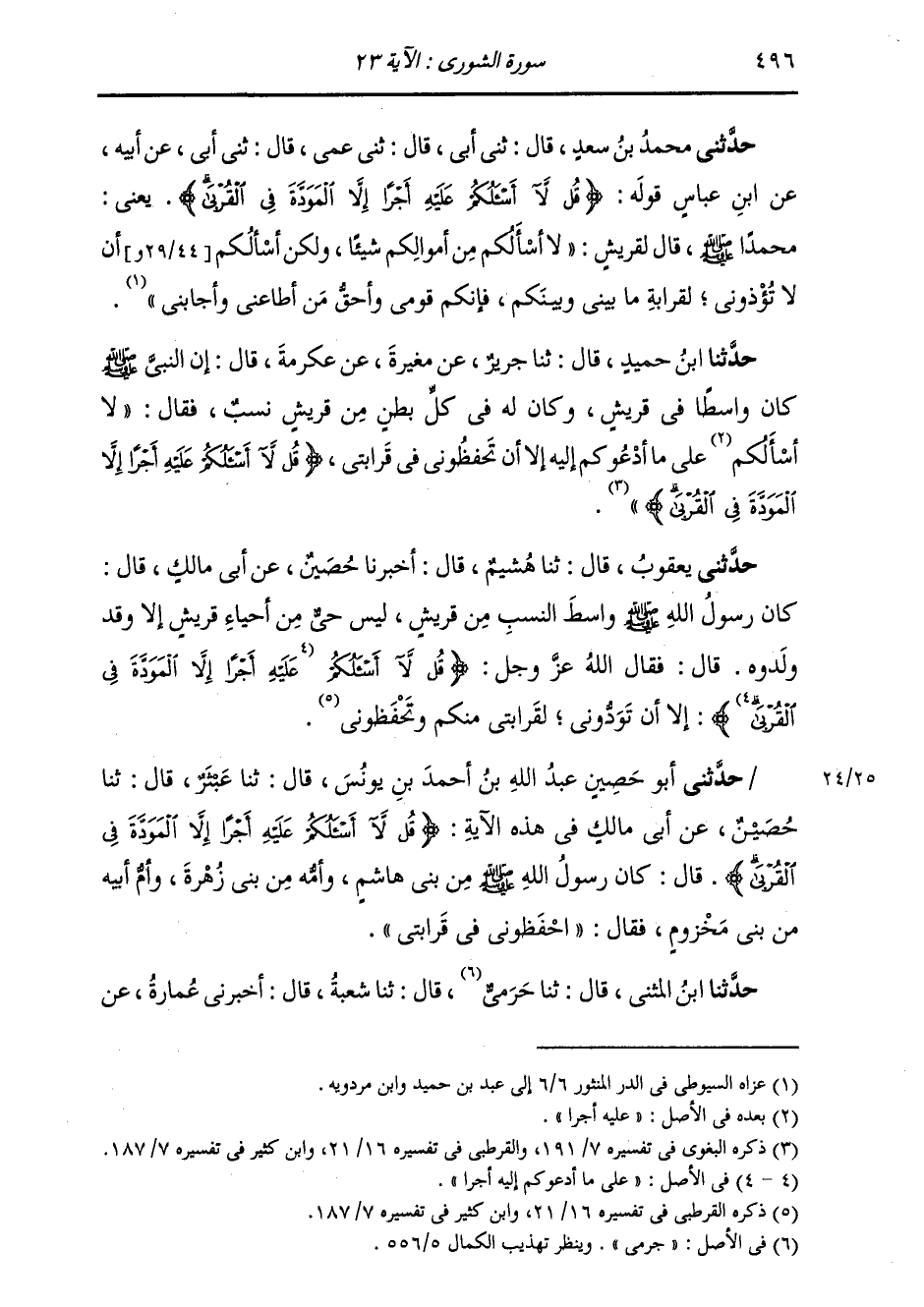 حَدَّثَنِي مُحَمَّدُ بْنُ سَعْدٍ قَالَ: ثَنِي أَبِي قَالَ: ثَنِي عمِّي قَالَ: ثَنِي أَبِي، عَنْ أَبِيهِ، عَنِ ابْنِ عَبَّاسٍ، قَوْلَهُ: {قُلْ لَا أَسْأَلُكُمْ عَلَيْهِ أَجْرًا إِلَّا الْمَوَدَّةَ فِي الْقُرْبَى} [الشورى: 23] يَعْنِي مُحَمَّدًا صَلَّى اللهُ عَلَيْهِ وَسَلَّمَ قَالَ لِقُرَيْشٍ: «§لَا أَسْأَلُكُمْ مِنْ أَمْوَالِكُمْ شَيْئًا، وَلَكِنْ أَسْأَلُكُمْ أَنْ لَا تُؤْذُونِي لَقَرَابَةِ مَا بَيْنِي وَبَيْنَكُمْ، فَإِنَّكُمْ قَوْمِي وَأَحَقُّ مَنْ أَطَاعَنِي وَأَجَابَنِي»