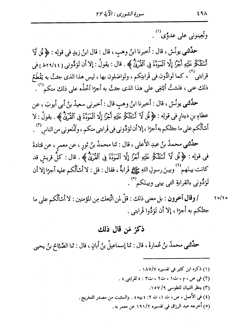 حَدَّثَنَا مُحَمَّدُ بْنُ عَبْدِ الْأَعْلَى قَالَ: ثَنَا مُحَمَّدُ بْنُ ثَوْرٍ، عَنْ مَعْمَرٍ، عَنْ قَتَادَةَ، فِي قَوْلِهِ: {§قُلْ لَا أَسْأَلُكُمْ عَلَيْهِ أَجْرًا إِلَّا الْمَوَدَّةَ فِي الْقُرْبَى} [الشورى: 23] قَالَ: " كُلُّ قُرَيْشٍ كَانَتْ بَيْنَهُمْ وَبَيْنَ رَسُولِ اللَّهِ صَلَّى اللهُ عَلَيْهِ وَسَلَّمَ قَرَابَةٌ، فَقَالَ: قُلْ لَا أَسْأَلُكُمْ عَلَيْهِ أَجْرًا إِلَّا أَنْ تَوَدُّونِي بِالْقَرَابَةِ الَّتِي بَيْنِي وَبَيْنَكُمْ " وَقَالَ آخَرُونَ: بَلْ مَعْنَى ذَلِكَ: قُلْ لِمَنْ تَبِعَكَ مِنَ الْمُؤْمِنِينَ: لَا أَسْأَلُكُمْ عَلَى مَا جِئْتُكُمْ بِهِ أَجْرًا إِلَّا أَنْ تَوَدُّوا قَرَابَتِي