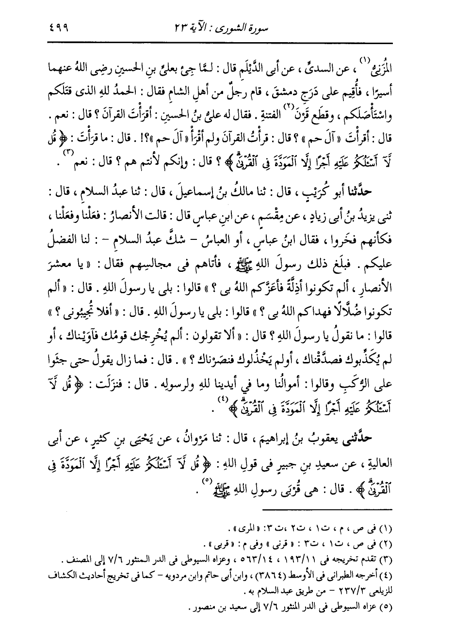 حَدَّثَنِي يَعْقُوبُ قَالَ: ثَنَا مَرْوَانُ، عَنْ يَحْيَى بْنِ كَثِيرٍ، عَنْ أَبِي الْعَالِيَةِ، عَنْ سَعِيدِ بْنِ جُبَيْرٍ، فِي قَوْلِهِ: {§قُلْ لَا أَسْأَلُكُمْ عَلَيْهِ أَجْرًا إِلَّا الْمَوَدَّةَ فِي الْقُرْبَى} [الشورى: 23] قَالَ: «هِيَ قُرْبَى رَسُولِ اللَّهِ صَلَّى اللهُ عَلَيْهِ وَسَلَّمَ»