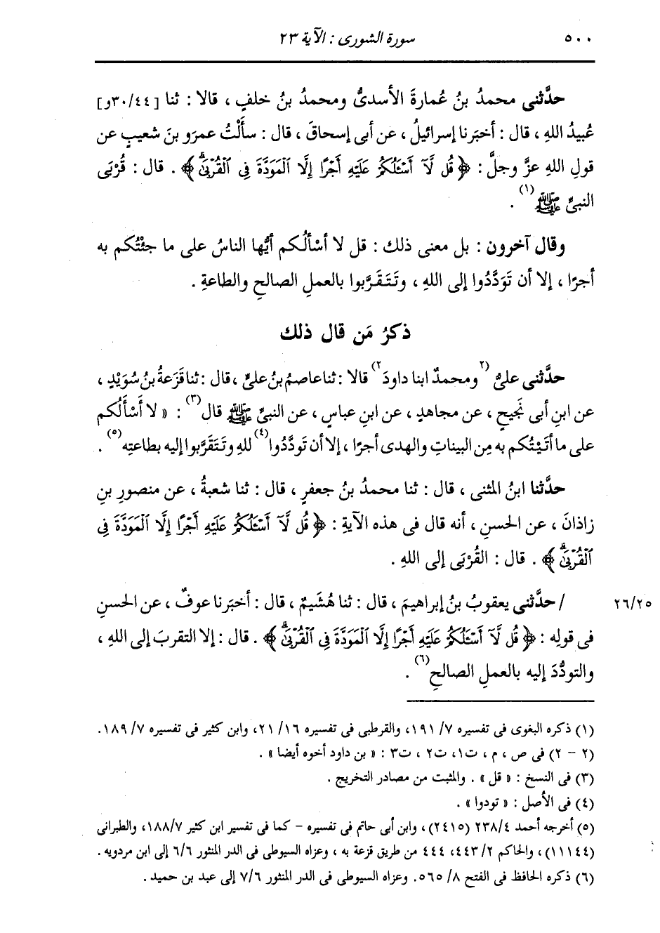 حَدَّثَنِي مُحَمَّدُ بْنُ عُمَارَةَ الْأَسَدِيُّ، وَمُحَمَّدُ بْنُ خَلَفٍ قَالَا: ثَنَا عُبَيْدُ اللَّهِ قَالَ: أَخْبَرَنَا إِسْرَائِيلُ، عَنْ أَبِي إِسْحَاقَ قَالَ: سَأَلْتُ عَمْرَو بْنَ شُعَيْبٍ، عَنْ قَوْلِ اللَّهِ، عَزَّ وَجَلَّ: {§قُلْ لَا أَسْأَلُكُمْ عَلَيْهِ أَجْرًا إِلَّا الْمَوَدَّةَ فِي الْقُرْبَى} [الشورى: 23] قَالَ: «قُرْبَى النَّبِيِّ صَلَّى اللهُ عَلَيْهِ وَسَلَّمَ» وَقَالَ آخَرُونَ: بَلْ مَعْنَى ذَلِكَ: قُلْ لَا أَسْأَلُكُمْ أَيُّهَا النَّاسُ عَلَى مَا جِئْتُكُمْ بِهِ أَجْرًا إِلَّا أَنْ تَوَدَّدُوا إِلَى اللَّهِ، وَتَتَقَرَّبُوا بِالْعَمَلِ الصَّالِحِ وَالطَّاعَةِ