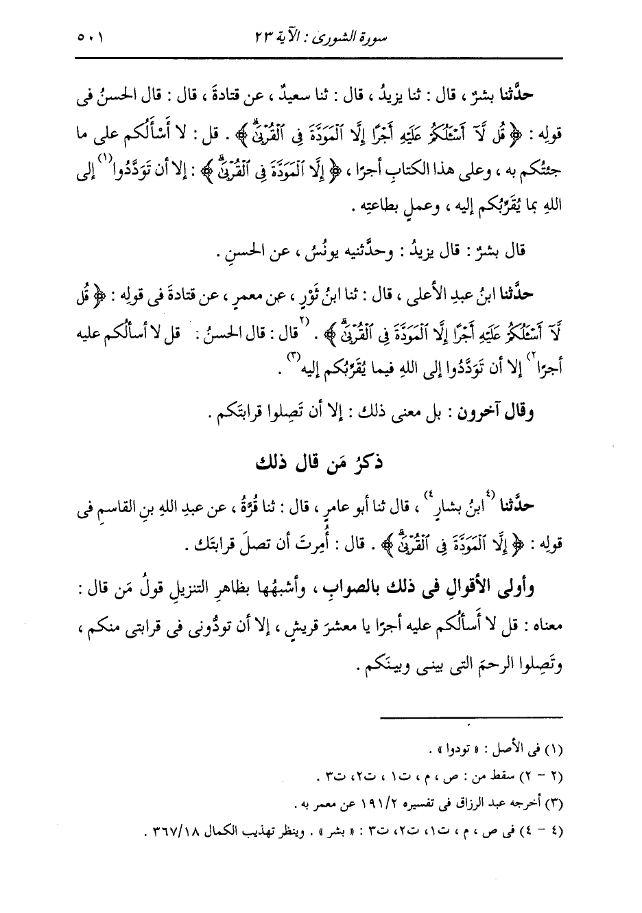 قَالَ بِشْرٌ: قَالَ يَزِيدُ: وَحَدَّثَنِيهِ يُونُسُ، عَنِ الْحَسَنِ، حَدَّثَنَا ابْنُ عَبْدِ الْأَعْلَى قَالَ: ثَنَا ابْنُ ثَوْرٍ، عَنْ مَعْمَرٍ، عَنْ قَتَادَةَ، فِي قَوْلِهِ: {§قُلْ لَا أَسْأَلُكُمْ عَلَيْهِ أَجْرًا إِلَّا الْمَوَدَّةَ فِي الْقُرْبَى} [الشورى: 23] «إِلَّا أَنْ تَوَدَّدُوا إِلَى اللَّهِ فِيمَا يُقَرِّبُكُمْ إِلَيْهِ» وَقَالَ آخَرُونَ: بَلْ مَعْنَى ذَلِكَ: إِلَّا أَنْ تَصِلُوا قَرَابَتَكُمْ