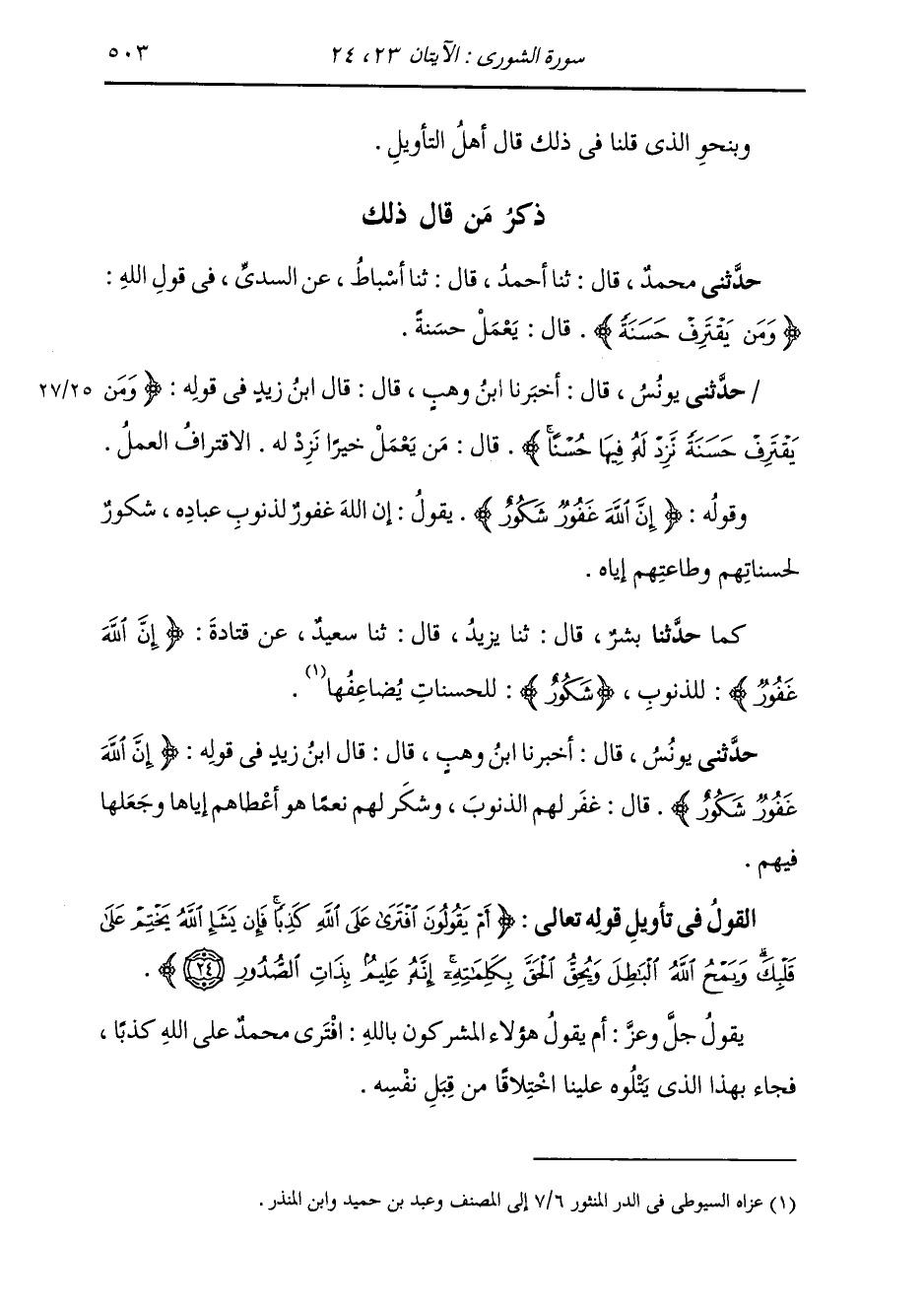 حَدَّثَنِي يُونُسُ قَالَ: أَخْبَرَنَا ابْنُ وَهْبٍ قَالَ: قَالَ ابْنُ زَيْدٍ، فِي قَوْلِهِ: {§إِنَّ اللَّهَ غَفُورٌ شَكُورٌ} [الشورى: 23] قَالَ: «غَفَرَ لَهُمُ الذُّنُوبَ، وَشَكَرَ لَهُمْ نِعَمًا هُوَ أَعْطَاهُمْ إِيَّاهَا، وَجَعَلَهَا فِيهِمْ»