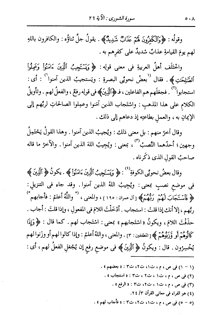 §وَقَوْلُهُ: {وَالْكَافِرُونَ لَهُمْ عَذَابٌ شَدِيدٌ} [الشورى: 26] يَقُولُ جَلَّ ثَنَاؤُهُ: وَالْكَافِرُونَ بِاللَّهِ لَهُمْ يَوْمَ الْقِيَامَةِ عَذَابٌ شَدِيدٌ عَلَى كُفْرِهِمْ بِهِ وَاخْتَلَفَ أَهْلُ الْعَرَبِيَّةِ فِي مَعْنَى قَوْلِهِ: {وَيَسْتَجِيبُ الَّذِينَ آمَنُوا} [الشورى: 26] فَقَالَ بَعْضُهُمْ: أَيِ اسْتَجَابَ فَجَعَلَهُمْ هُمُ الْفَاعِلِينَ، فَالَّذِينَ فِي قَوْلِهِ رَفْعٌ، وَالْفِعْلُ لَهُمْ وَتَأْوِيلُ الْكَلَامِ عَلَى هَذَا الْمَذْهَبِ: وَاسْتَجَابَ الَّذِينَ آمَنُوا وَعَمِلُوا الصَّالِحَاتِ لِرَبِّهِمْ إِلَى الْإِيمَانِ بِهِ، وَالْعَمَلِ بِطَاعَتِهِ إِذْ دَعَاهُمْ إِلَى ذَلِكَ وَقَالَ آخَرُ مِنْهُمْ: بَلْ مَعْنَى ذَلِكَ: وَيُجِيبُ الَّذِينَ آمَنُوا وَهَذَا الْقَوْلُ يَحْتَمِلُ وَجْهَيْنِ: أَحَدُهُمَا الرَّفْعُ، بِمَعْنَى: وَيُجِيبُ اللَّهُ الَّذِينَ آمَنُوا وَالْآخَرُ مَا قَالَهُ صَاحِبُ الْقَوْلِ الَّذِي ذَكَرْنَا وَقَالَ بَعْضُ نَحْوِيِّي الْكُوفَةِ: {وَيَسْتَجِيبُ الَّذِينَ آمَنُوا} [الشورى: 26] يَكُونُ «الَّذِينَ» فِي مَوْضِعِ نَصْبٍ بِمَعْنَى: وَيُجِيبُ اللَّهُ الَّذِينَ آمَنُوا وَقَدْ جَاءَ فِي التَّنْزِيلِ: {فَاسْتَجَابَ لَهُمْ رَبُّهُمْ} [آل عمران: 195] وَالْمَعْنَى: فَأَجَابَ لَهُمْ رَبُّهُمْ، إِلَّا أَنَّكَ إِذَا قُلْتَ اسْتَجَابَ، أَدْخَلْتَ اللَّامَ فِي الْمَفْعُولِ، وَإِذَا قُلْتَ أَجَابَ حَذَفْتَ اللَّامَ، وَيَكُونُ اسْتَجَابَهُمْ، بِمَعْنَى: اسْتَجَابَ لَهُمْ، كَمَا قَالَ جَلَّ ثَنَاؤُهُ: {وَإِذَا كَالُوهُمْ أَوْ وَزَنُوهُمْ} [المطففين: 3] وَالْمَعْنَى وَاللَّهُ أَعْلَمُ: إِذَا كَالُوا لَهُمْ، أَوْ وَزَنَوْا لَهُمْ {يُخْسِرُونَ} [المطففين: 3] قَالَ: وَيَكُونُ «الَّذِينَ» فِي مَوْضِعِ رَفْعٍ إِنْ يُجْعَلِ الْفِعْلُ لَهُمْ، أَيِ