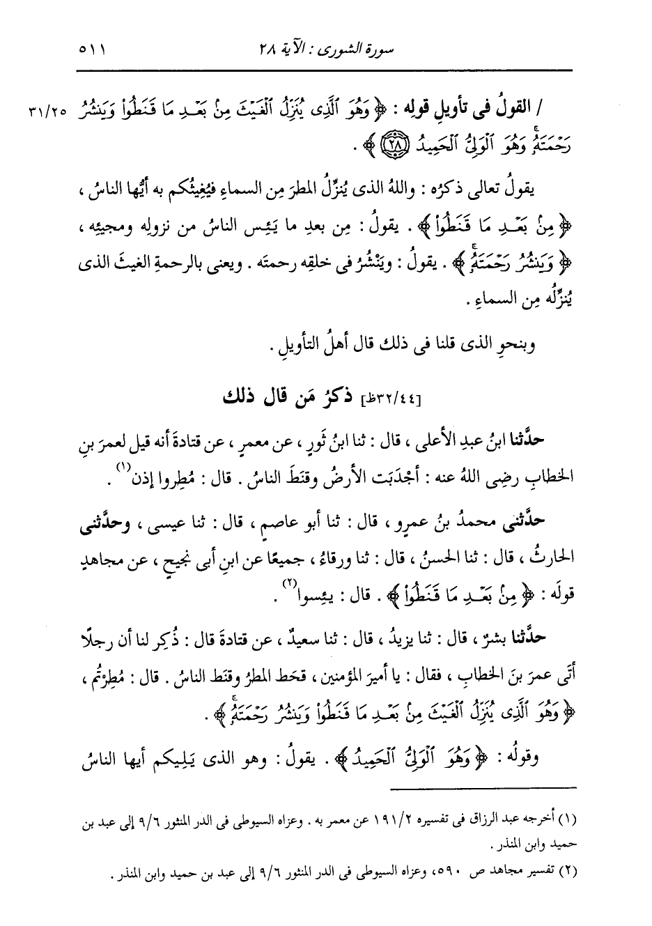 §الْقَوْلُ فِي تَأْوِيلِ قَوْلِهِ تَعَالَى: {وَهُوَ الَّذِي يُنَزِّلُ الْغَيْثَ مِنْ بَعْدِ مَا قَنَطُوا وَيَنشُرُ رَحْمَتَهُ وَهُوَ الْوَلِيُّ الْحَمِيدُ} [الشورى: 28] يَقُولُ تَعَالَى ذِكْرُهُ: وَاللَّهُ الَّذِي يُنَزِّلُ الْمَطَرَ مِنَ السَّمَاءِ فَيُغِيثُكُمْ بِهِ أَيُّهَا النَّاسُ {مِنْ بَعْدِ مَا قَنَطُوا} [الشورى: 28] يَقُولُ: مِنْ بَعْدِ مَا يُئِسَ مِنْ نُزُولِهِ وَمَجِيئِهِ {وَيَنشُرُ رَحْمَتَهُ} [الشورى: 28] يَقُولُ: وَيَنْشُرُ فِي خَلْقِهِ رَحْمَتَهُ، وَيَعْنِي بِالرَّحْمَةِ: الْغَيْثَ الَّذِي يُنَزِّلُهُ مِنَ السَّمَاءِ وَبِنَحْوِ الَّذِي قُلْنَا فِي ذَلِكَ قَالَ أَهْلُ التَّأْوِيلِ