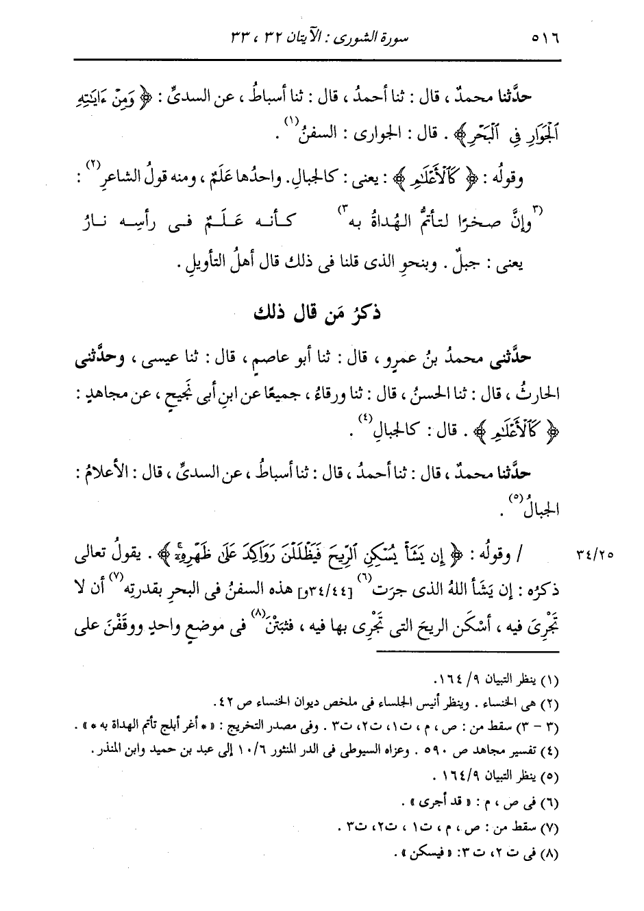 حَدَّثَنَا مُحَمَّدٌ قَالَ: ثَنَا أَحْمَدُ قَالَ: ثَنَا أَسْبَاطُ، عَنِ السُّدِّيِّ، {§وَمِنْ آيَاتِهِ الْجَوَارِ فِي الْبَحْرِ} [الشورى: 32] قَالَ: " الْجَوَارِي: السُّفُنُ "
