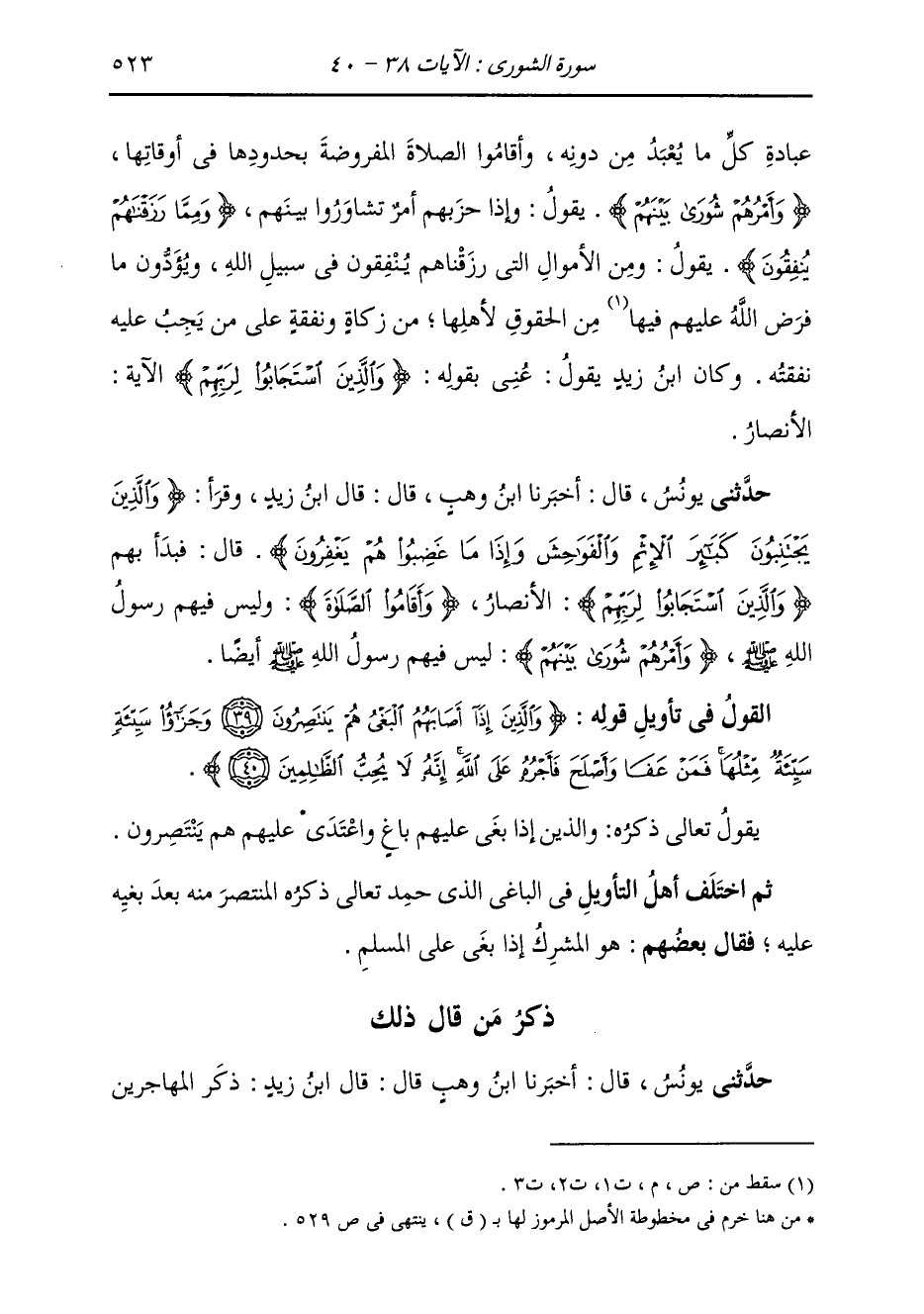 حَدَّثَنِي يُونُسُ قَالَ: أَخْبَرَنَا ابْنُ وَهْبٍ قَالَ: قَالَ ابْنُ زَيْدٍ، وَقَرَأَ {§وَالَّذِينَ يَجْتَنِبُونَ كَبَائِرَ الْإِثْمِ وَالْفَوَاحِشَ وَإِذَا مَا غَضِبُوا هُمْ يَغْفِرُونَ} [الشورى: 37] قَالَ: «فَبَدَأَ بِهِمْ» {وَالَّذِينَ اسْتَجَابُوا لِرَبِّهِمْ} [الشورى: 38] «الْأَنْصَارُ» {وَأَقَامُوا الصَّلَاةَ} [الشورى: 38] «وَلَيْسَ فِيهِمْ رَسُولُ اللَّهِ صَلَّى اللهُ عَلَيْهِ وَسَلَّمَ» {وَأَمْرُهُمْ شُورَى بَيْنَهُمْ} [الشورى: 38] «لَيْسَ فِيهِمْ رَسُولُ اللَّهِ صَلَّى اللهُ عَلَيْهِ وَسَلَّمَ أَيْضًا»