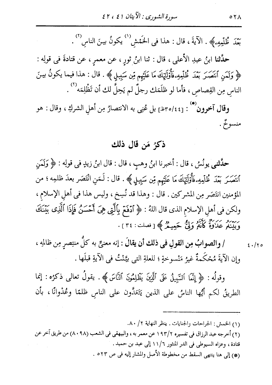 حَدَّثَنَا ابْنُ عَبْدِ الْأَعْلَى قَالَ: ثَنَا ابْنُ ثَوْرٍ، عَنْ مَعْمَرٍ، عَنْ قَتَادَةَ، فِي قَوْلِهِ: {§وَلَمَنِ انْتَصَرَ بَعْدَ ظُلْمِهِ فَأُولَئِكَ مَا عَلَيْهِمْ مِنْ سَبِيلٍ} [الشورى: 41] قَالَ: «هَذَا فِيمَا يَكُونُ بَيْنَ النَّاسِ مِنَ الْقِصَاصِ، فَأَمَّا لَوْ ظَلَمَكَ رَجُلٌ لَمْ يَحِلَّ لَكَ أَنْ تَظْلِمَهُ» وَقَالَ آخَرُونَ: بَلْ عَنَى بِهِ الِانْتِصَارَ مِنْ أَهْلِ الشِّرْكِ، وَقَالَ: هَذَا مَنْسُوخٌ