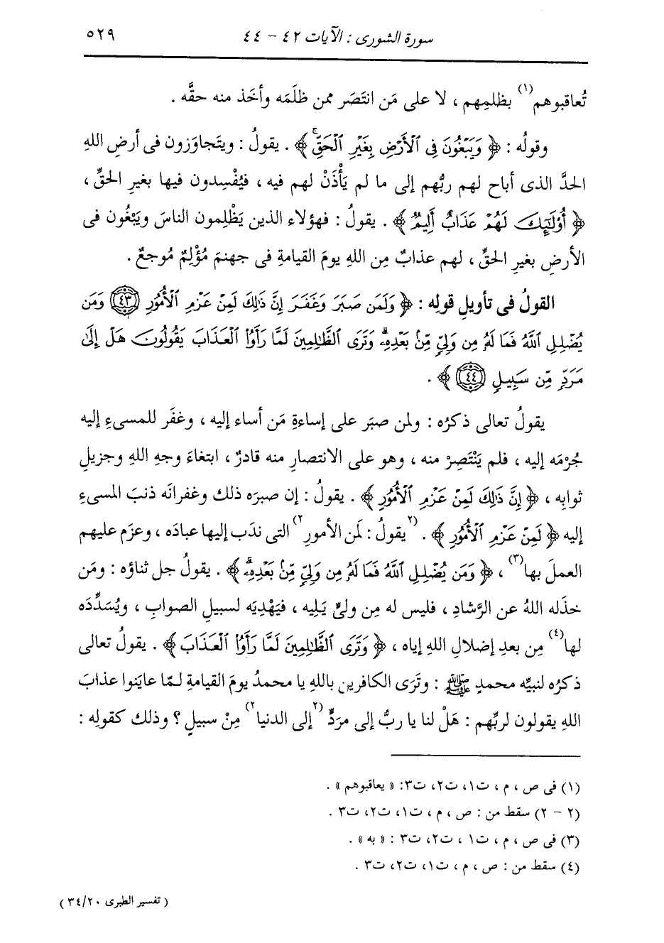 §الْقَوْلُ فِي تَأْوِيلِ قَوْلِهِ تَعَالَى: {وَلَمَنْ صَبَرَ وَغَفَرَ إِنَّ ذَلِكَ لَمِنْ عَزْمِ الْأُمُورِ وَمَنْ يُضْلِلِ اللَّهُ فَمَا لَهُ مِنْ وَلِيٍّ مِنْ بَعْدِهِ وَتَرَى الظَّالِمِينَ لَمَّا رَأَوُا الْعَذَابَ يَقُولُونَ هَلْ إِلَى مَرَدٍّ مِنْ سَبِيلٍ} [الشورى: 44] يَقُولُ تَعَالَى ذِكْرُهُ: وَلَمَنْ صَبَرَ عَلَى إِسَاءَةٍ إِلَيْهِ، وَغَفَرَ لِلْمُسِيءِ إِلَيْهِ جُرْمَهُ إِلَيْهِ، فَلَمْ يَنْتَصِرْ مِنْهُ، وَهُوَ عَلَى الِانْتِصَارِ مِنْهُ قَادِرٌ ابْتِغَاءَ وَجْهِ اللَّهِ وَجَزِيلِ ثَوَابِهِ {إِنَّ ذَلِكَ لَمَنْ عَزْمِ الْأُمُورِ} [الشورى: 43] يَقُولُ: إِنَّ صَبْرَهُ ذَلِكَ وَغُفْرَانَهُ ذَنْبَ الْمُسِيءِ إِلَيْهِ، لَمَنْ عَزْمِ الْأُمُورِ الَّتِي نَدَبَ إِلَيْهَا عِبَادَهُ، وَعَزَمَ عَلَيْهِمُ الْعَمَلَ بِهِ {وَمَنْ يُضْلِلِ اللَّهُ فَمَا لَهُ مِنْ وَلِيٍّ مِنْ بَعْدِهِ} [الشورى: 44] يَقُولُ: وَمَنْ خَذَلَهُ اللَّهُ عَنِ الرَّشَادِ، فَلَيْسَ لَهُ مِنْ وَلِيٍّ يَلِيهِ، فَيَهْدِيهِ لِسَبِيلِ الصَّوَابِ، وَيُسَدِّدُهُ مِنْ بَعْدِ إِضْلَالِ اللَّهِ إِيَّاهُ {وَتَرَى الظَّالِمِينَ لَمَّا رَأَوُا الْعَذَابَ} [الشورى: 44] يَقُولُ تَعَالَى ذِكْرُهُ لِنَبِيِّهِ مُحَمَّدٍ صَلَّى اللهُ عَلَيْهِ وَسَلَّمَ: وَتَرَى الْكَافِرِينَ بِاللَّهِ يَا مُحَمَّدُ يَوْمَ الْقِيَامَةِ لَمَّا عَايَنُوا عَذَابَ اللَّهِ يَقُولُونَ لِرَبِّهِمْ: {هَلْ} [البقرة: 210] لَنَا يَا رَبِّ {إِلَى مَرَدٍّ مِنْ سَبِيلٍ} [الشورى: 44] وَذَلِكَ كَقَوْلِهِ