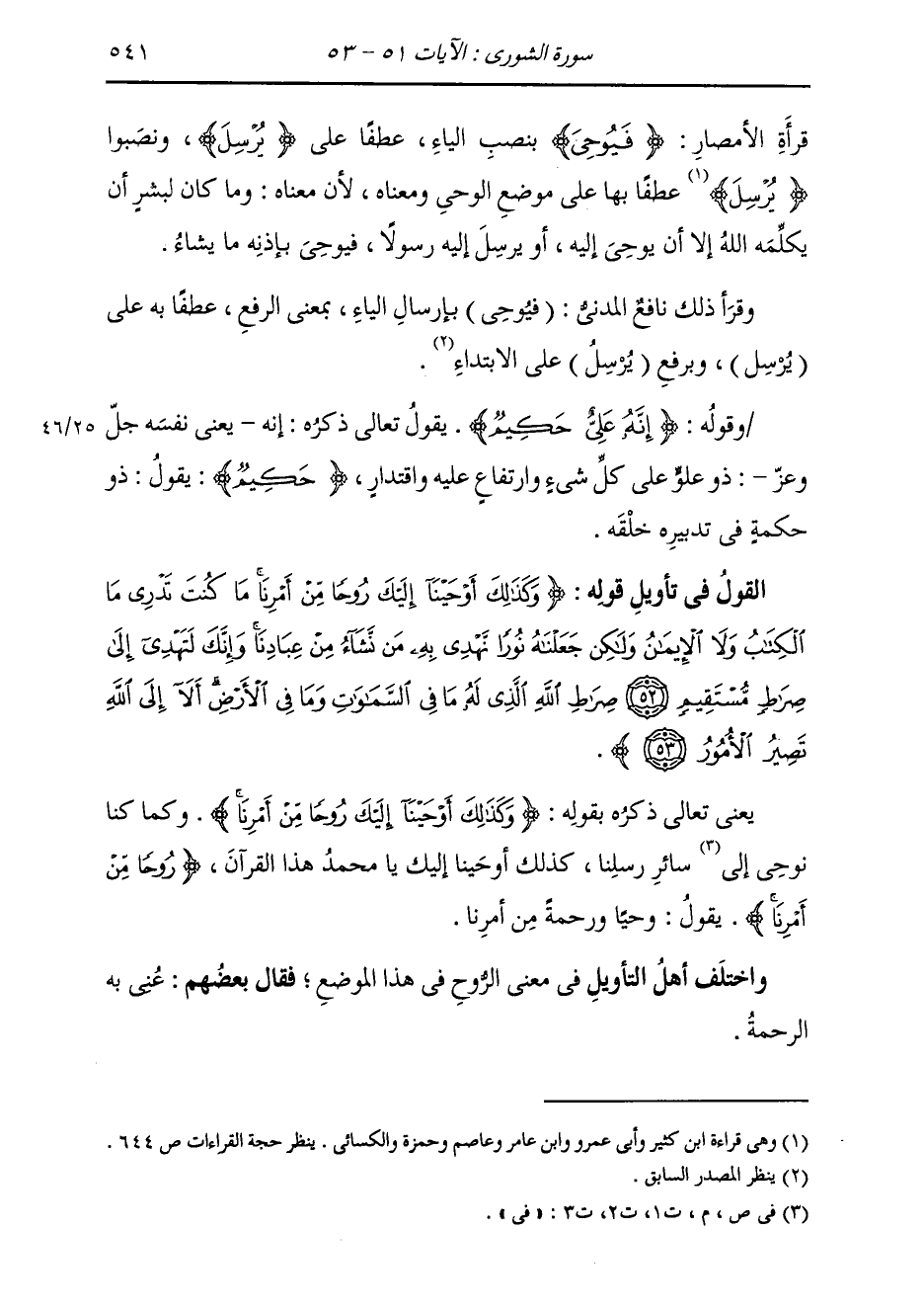 قُرَّاءِ الْأَمْصَارِ {فَيُوحِيَ} [الشورى: 51] بِنَصْبِ الْيَاءِ عَطْفًا عَلَى {يُرْسِلَ} [الشورى: 51] ، وَنَصَبُوا {يُرْسِلَ} [الشورى: 51] عَطْفًا بِهَا عَلَى مَوْضِعِ الْوَحْيِ وَمَعْنَاهُ، لِأَنَّ مَعْنَاهُ وَمَا كَانَ لِبَشَرٍ أَنْ يُكَلِّمَهُ اللَّهُ إِلَّا أَنْ يُوحِيَ إِلَيْهِ أَوْ يُرْسِلَ إِلَيْهِ رَسُولًا فَيُوحِيَ بِإِذْنِهِ مَا يَشَاءُ وَقَرَأَ ذَلِكَ نَافِعٌ الْمَدَنِيُّ (فَيُوحِي) بِإِرْسَالِ الْيَاءِ بِمَعْنَى الرَّفْعِ عَطْفًا بِهِ عَلَى (يُرْسِلُ) ، وَبِرَفْعِ (يُرْسِلُ) عَلَى الِابْتِدَاءِ