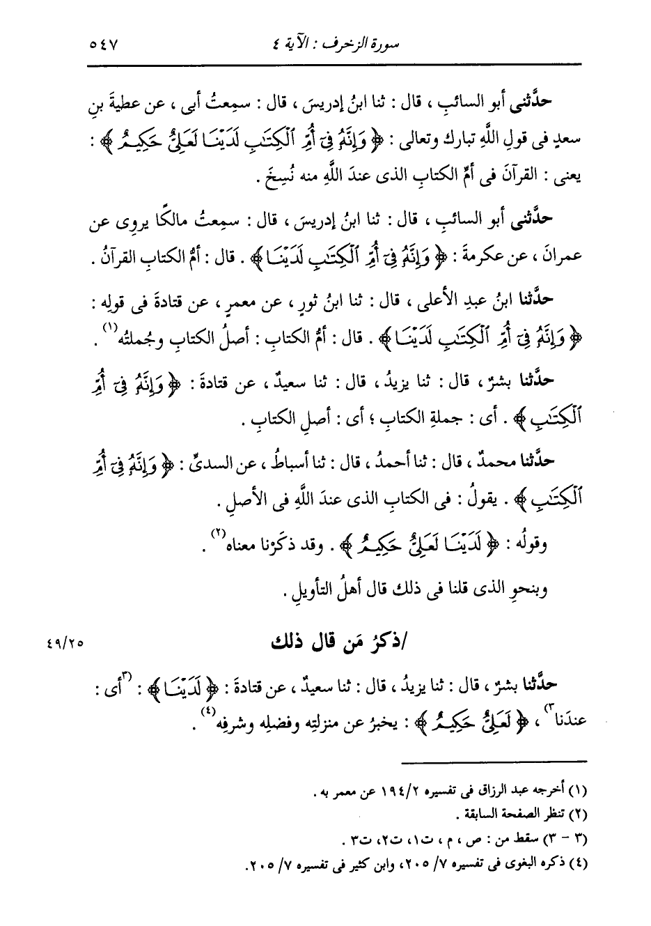 حَدَّثَنَا بِشْرٌ قَالَ: ثَنَا يَزِيدُ قَالَ: ثَنَا سَعِيدٌ، عَنْ قَتَادَةَ {§وَإِنَّهُ فِي أُمِّ الْكِتَابِ} [الزخرف: 4] «أَيْ جُمْلَةُ الْكِتَابِ أَيْ أَصْلُ الْكِتَابِ»