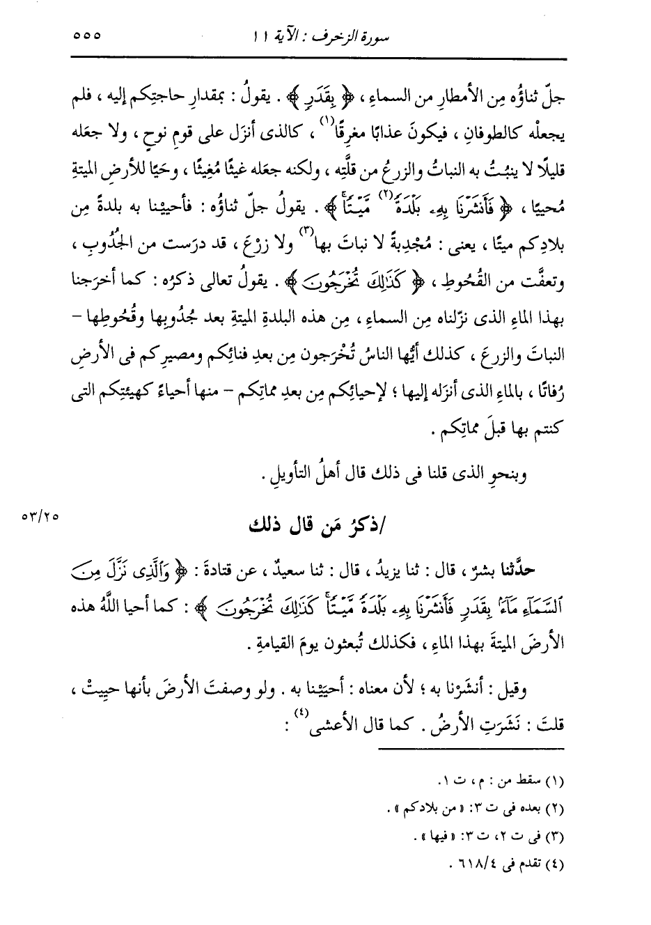 ذِكْرُ مَنْ قَالَ ذَلِكَ: حَدَّثَنَا بِشْرٌ قَالَ: ثَنَا يَزِيدُ قَالَ: ثَنَا سَعِيدٌ، عَنْ قَتَادَةَ، {§وَالَّذِي نَزَّلَ مِنَ السَّمَاءِ مَاءً بِقَدَرٍ} [الزخرف: 11] الْآيَةَ، «كَمَا أَحْيَا اللَّهُ هَذِهِ الْأَرْضَ الْمَيْتَةَ بِهَذَا الْمَاءِ كَذَلِكَ تُبْعَثُونَ يَوْمَ الْقِيَامَةِ» وَقِيلَ: أَنْشَرْنَا بِهِ، لِأَنَّ مَعْنَاهُ: أَحْيَيْنَا بِهِ، وَلَوْ وَصَفْتَ الْأَرْضَ بِأَنَّهَا أُحْيِيَتْ، قِيلَ: نُشِرَتِ الْأَرْضُ، كَمَا قَالَ الْأَعْشَى: