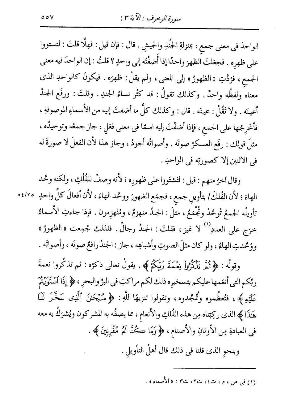 الْوَاحِدَ فِي مَعْنَى جَمْعٍ بِمَنْزِلَةِ الْجُنْدِ وَالْجَيْشِ قَالَ: فَإِنْ قِيلَ: فَهَلَّا قُلْتَ: لِتَسْتَوُوا عَلَى ظَهْرِهِ، فَجَعَلْتَ الظَّهْرَ وَاحِدًا إِذَا أَضَفْتَهُ إِلَى وَاحِدٍ قُلْتُ: إِنَّ الْوَاحِدَ فِيهِ مَعْنَى الْجَمْعِ، فَرُدَّتِ الظُّهُورُ إِلَى الْمَعْنَى، وَلَمْ يَقُلْ ظَهْرِهِ، فَيَكُونُ كَالْوَاحِدِ الَّذِي مَعْنَاهُ وَلَفْظُهُ وَاحِدٌ وَكَذَلِكَ تَقُولُ: قَدْ كَثُرَ نِسَاءُ الْجُنْدِ، وَقُلْتُ: وَرَفَعَ الْجُنْدُ أَعْيُنَهُ وَلَمْ يَقُلْ عَيْنَهُ قَالَ: وَكَذَلِكَ كُلُّ مَا أَضَفْتَ إِلَيْهِ مِنَ الْأَسْمَاءِ الْمَوْصُوفَةِ، فَأَخْرَجَهَا عَلَى الْجَمْعِ، وَإِذَا أَضَفْتَ إِلَيْهِ اسْمًا فِي مَعْنَى فِعْلٍ جَازَ جَمْعُهُ وَتَوْحِيدُهُ، مِثْلَ قَوْلِكَ: رَفَعَ الْعَسْكَرُ صَوْتَهُ، وَأَصْوَاتَهُ أَجْوَدُ وَجَازَ هَذَا لِأَنَّ الْفِعْلَ لَا صُورَةَ لَهُ فِي الِاثْنَيْنِ إِلَّا الصُّورَةِ فِي الْوَاحِدِ وَقَالَ آخَرُ مِنْهُمْ: قِيلَ: لِتَسْتَوُوا عَلَى ظَهْرِهِ، لِأَنَّهُ وَصْفٌ لِلْفُلْكِ، وَلَكِنَّهُ وَحَّدَ الْهَاءَ، لِأَنَّ الْفُلْكَ بِتَأْوِيلِ جَمْعٍ، فَجَمَعَ الظُّهُورَ وَوَحَّدَ الْهَاءَ، لِأَنَّ أَفْعَالَ كُلِّ وَاحِدٍ تَأْوِيلُهُ الْجَمْعُ تُوَحَّدُ وَتُجْمَعُ مِثْلَ: الْجُنْدُ مُنْهَزِمٌ وَمُنْهَزِمُونَ، فَإِذَا جَاءَتِ الْأَسْمَاءُ خَرَجَ عَلَى الْأَسْمَاءِ لَا غَيْرُ، فَقُلْتَ: الْجُنْدُ رِجَالٌ، فَلِذَلِكَ جُمِعَتِ الظُّهُورُ وَوُحِّدَتِ الْهَاءُ، وَلَوْ كَانَ مِثْلُ الصَّوْتِ وَأَشْبَاهِهِ جَازَ الْجُنْدُ رَافِعٌ صَوْتَهُ وَأَصْوَاتَهُ
