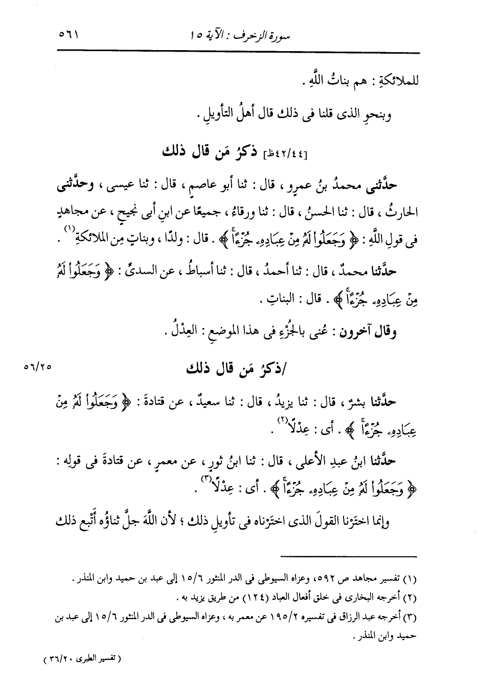 ذِكْرُ مَنْ قَالَ ذَلِكَ: حَدَّثَنِي مُحَمَّدُ بْنُ عَمْرٍو قَالَ: ثَنَا أَبُو عَاصِمٌ قَالَ: ثَنَا عِيسَى، وَحَدَّثَنِي الْحَارِثُ قَالَ: ثَنَا الْحَسَنُ قَالَ: ثَنَا وَرْقَاءُ، جَمِيعًا، عَنِ ابْنِ أَبِي نَجِيحٍ، عَنْ مُجَاهِدٍ، فِي قَوْلِ اللَّهِ عَزَّ وَجَلَّ: {§وَجَعَلُوا لَهُ مِنْ عِبَادِهِ جُزْءًا} [الزخرف: 15] قَالَ: «وَلَدًا وَبَنَاتٍ مِنَ الْمَلَائِكَةِ»