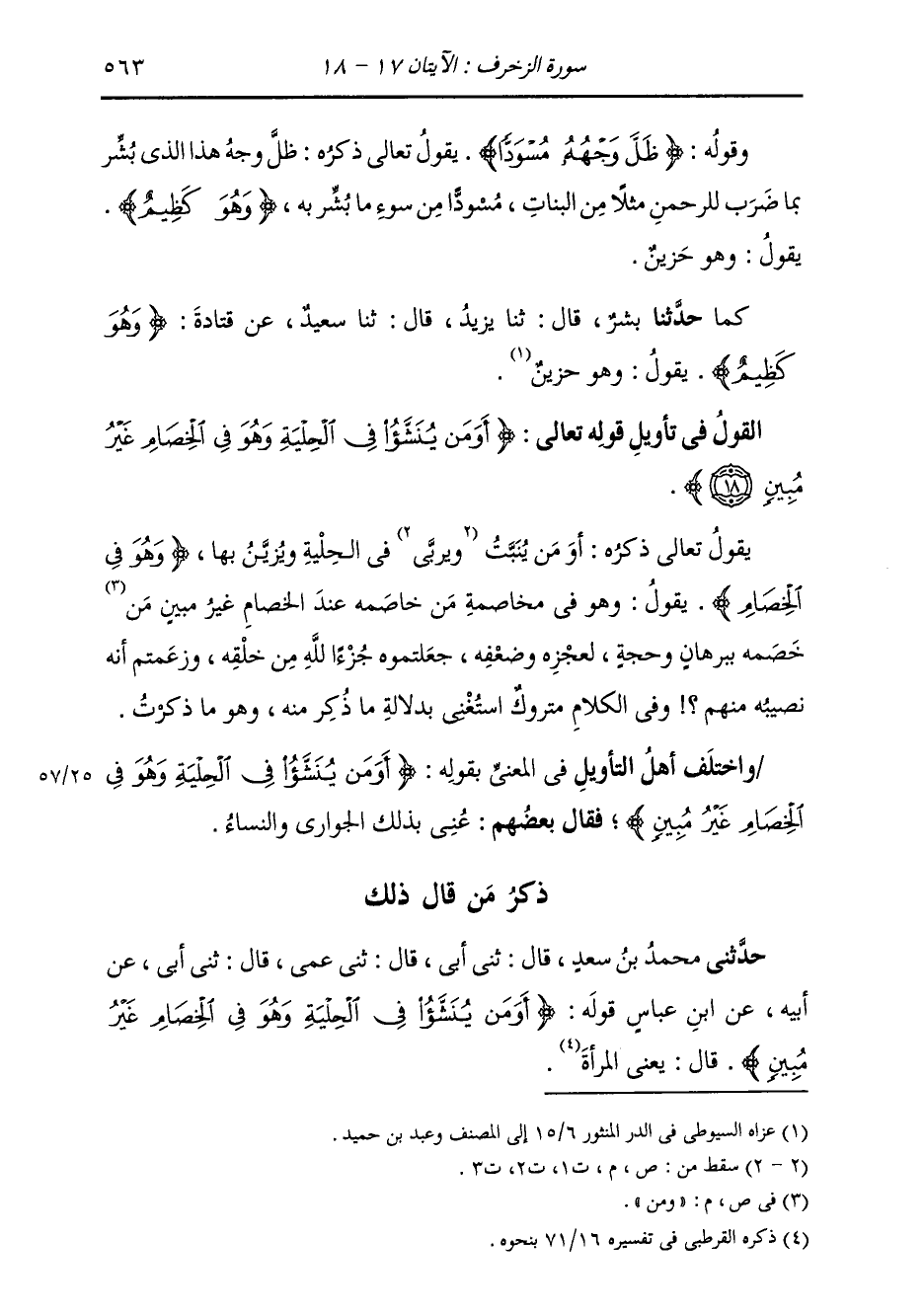 §الْقَوْلُ فِي تَأْوِيلِ قَوْلِهِ تَعَالَى: {أَوَمَنْ يُنَشَّأُ فِي الْحِلْيَةِ وَهُوَ فِي الْخِصَامِ غَيْرُ مُبِينٍ} [الزخرف: 18] يَقُولُ تَعَالَى ذِكْرُهُ: أَوَمَنْ يُنْبَتُ فِي الْحِلْيَةِ وَيُزَيَّنُ بِهَا {وَهُوَ فِي الْخِصَامِ} [الزخرف: 18] يَقُولُ: وَهُوَ فِي مُخَاصَمَةِ مَنْ خَاصَمَهُ عِنْدَ الْخِصَامِ غَيْرُ مُبِينٍ، وَمَنْ خَصَمَهُ بِبُرْهَانٍ وَحُجَّةٍ، لِعَجْزِهِ وَضَعْفِهِ، جَعَلْتُمُوهُ جُزْءَ اللَّهِ مِنْ خَلْقِهِ وَزَعَمْتُمْ أَنَّهُ نَصِيبُهُ مِنْهُمْ، وَفِي الْكَلَامِ مَتْرُوكٌ اسْتُغْنِيَ بِدِلَالَةِ مَا ذُكِرَ مِنْهُ وَهُوَ مَا ذَكَرْتُ وَاخْتَلَفَ أَهْلُ التَّأْوِيلِ فِي الْمَعْنِيِّ بِقَوْلِهِ: {أَوَمَنْ يُنَشَّأُ فِي الْحِلْيَةِ وَهُوَ فِي الْخِصَامِ غَيْرُ مُبِينٍ} [الزخرف: 18] ، فَقَالَ بَعْضُهُمْ: عُنِيَ بِذَلِكَ الْجَوَارِي وَالنِّسَاءُ