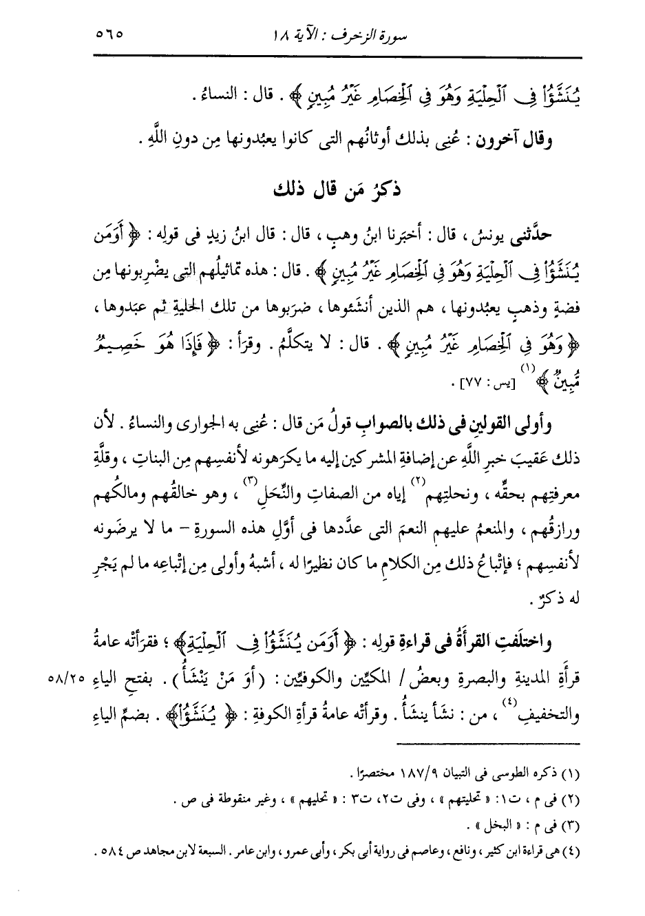 ذِكْرُ مَنْ قَالَ ذَلِكَ: حَدَّثَنِي يُونُسُ قَالَ: أَخْبَرَنَا ابْنُ وَهْبٍ قَالَ: قَالَ ابْنُ زَيْدٍ، فِي قَوْلِهِ: {§أَوَمَنْ يُنَشَّأُ فِي الْحِلْيَةِ} [الزخرف: 18] الْآيَةَ قَالَ: «هَذِهِ تَمَاثِيلُهُمُ الَّتِي يَضْرِبُونَهَا مِنْ فِضَّةٍ وَذَهَبٍ يَعْبُدُونَهَا هُمُ الَّذِينَ أَنْشَأُوهَا، ضَرَبُوهَا مِنْ تِلْكَ الْحِلْيَةِ، ثُمَّ عَبَدُوهَا» {وَهُوَ فِي الْخِصَامِ غَيْرُ مُبِينٍ} [الزخرف: 18] قَالَ: «لَا يَتَكَلَّمُ» ، وَقَرَأَ {فَإِذَا هُوَ خَصِيمٌ مُبِينٌ} [النحل: 4] وَأَوْلَى الْقَوْلَيْنِ فِي ذَلِكَ بِالصَّوَابِ قَوْلُ مَنْ قَالَ: عُنِيَ بِذَلِكَ الْجَوَارِي وَالنِّسَاءُ، لِأَنَّ ذَلِكَ عَقِيبَ خَبَرِ اللَّهِ عَنْ إِضَافَةِ الْمُشْرِكِينَ إِلَيْهِ مَا يَكْرَهُونَهُ لِأَنْفُسِهِمْ مِنَ الْبَنَاتِ، وَقِلَّةِ مَعْرِفَتِهِمْ بِحَقِّهِ، وَتَحْلِيَتِهِمْ إِيَّاهُ مِنَ الصِّفَاتِ وَالْبُخْلِ، وَهُوَ خَالِقُهُمْ وَمَالِكُهُمْ وَرَازِقُهُمْ، وَالْمُنْعِمُ عَلَيْهِمُ النِّعَمَ الَّتِي عَدَّدَهَا فِي أَوَّلِ هَذِهِ السُّورَةِ مَا لَا يَرْضَوْنَهُ لِأَنْفُسِهِمْ، فَاتِّبَاعُ ذَلِكَ مِنَ الْكَلَامِ مَا كَانَ نَظِيرًا لَهُ أَشْبَهُ وَأَوْلَى مِنَ اتِّبَاعِهِ مَا لَمْ يَجِرِ لَهُ ذِكْرٌ وَاخْتَلَفَ الْقُرَّاءُ فِي قِرَاءَةِ قَوْلِهِ: {أَوَمَنْ يُنَشَّأُ فِي الْحِلْيَةِ} [الزخرف: 18] فَقَرَأَتْهُ عَامَّةُ قُرَّاءِ الْمَدِينَةِ وَالْبَصْرَةِ وَبَعْضُ الْمَكِّيِّينَ وَالْكُوفِيِّينَ (أَوَمَنْ يَنْشَأُ) بِفَتْحِ الْيَاءِ وَالتَّخْفِيفِ مِنْ نَشَأَ يَنْشَأُ وَقَرَأَتْهُ عَامَّةُ قُرَّاءِ الْكُوفَةِ {يُنَشَّأُ} [الزخرف: 18] بِضَمِّ الْيَاءِ
