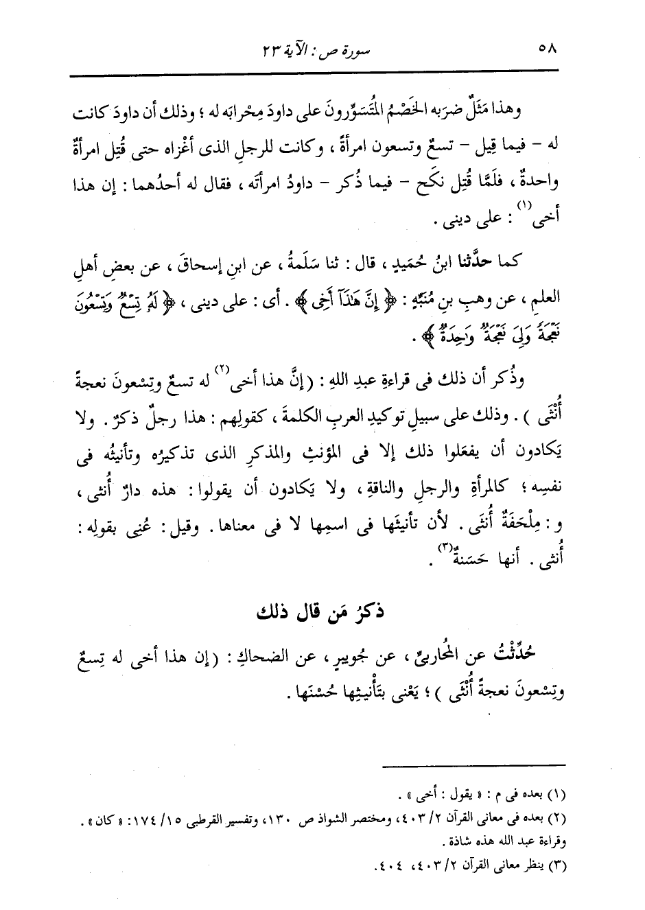 كَمَا: حَدَّثَنَا ابْنُ حُمَيْدٍ، قَالَ: ثنا سَلَمَةُ، عَنِ ابْنِ إِسْحَاقَ، عَنْ بَعْضِ أَهْلِ الْعِلْمِ، عَنْ وَهْبِ بْنِ مُنَبِّهٍ: {§إِنَّ هَذَا أَخِي} [ص: 23] «أَيْ عَلَى دِينِي» {لَهُ تِسْعٌ وَتِسْعُونَ نَعْجَةً وَلِي نَعْجَةً وَاحِدَةً} [ص: 23] وَذُكِرَ أَنَّ ذَلِكَ فِي قِرَاءَةِ عَبْدِ اللَّهِ: «وَإِنَّ هَذَا أَخِي لَهُ تِسْعٌ وَتِسْعُونَ نَعْجَةً أُنْثَى» وَذَلِكَ عَلَى سَبِيلِ تَوْكِيدِ الْعَرَبِ الْكَلِمَةَ، كَقَوْلِهِمْ: هَذَا رَجُلٌ ذَكَرٌ، وَلَا يَكَادُونَ أَنْ يَفْعَلُوا ذَلِكَ إِلَّا فِي الْمُؤَنَّثِ وَالْمُذَكَّرِ الَّذِي تَذْكِيرُهُ وَتَأْنِيثُهُ فِي نَفْسِهِ كَالْمَرْأَةُ وَالرَّجُلُ وَالنَّاقَةُ، وَلَا يَكَادُونَ أَنْ يَقُولُوا هَذِهِ دَارٌ أُنْثَى، وَمِلْحَفَةٌ أُنْثَى، لِأَنَّ تَأْنِيثَهَا فِي اسْمِهَا لَا فِي مَعْنَاهَا. وَقِيلَ: عَنَى بِقَوْلِهِ: أُنْثَى: أَنَّهَا حَسَنَةٌ