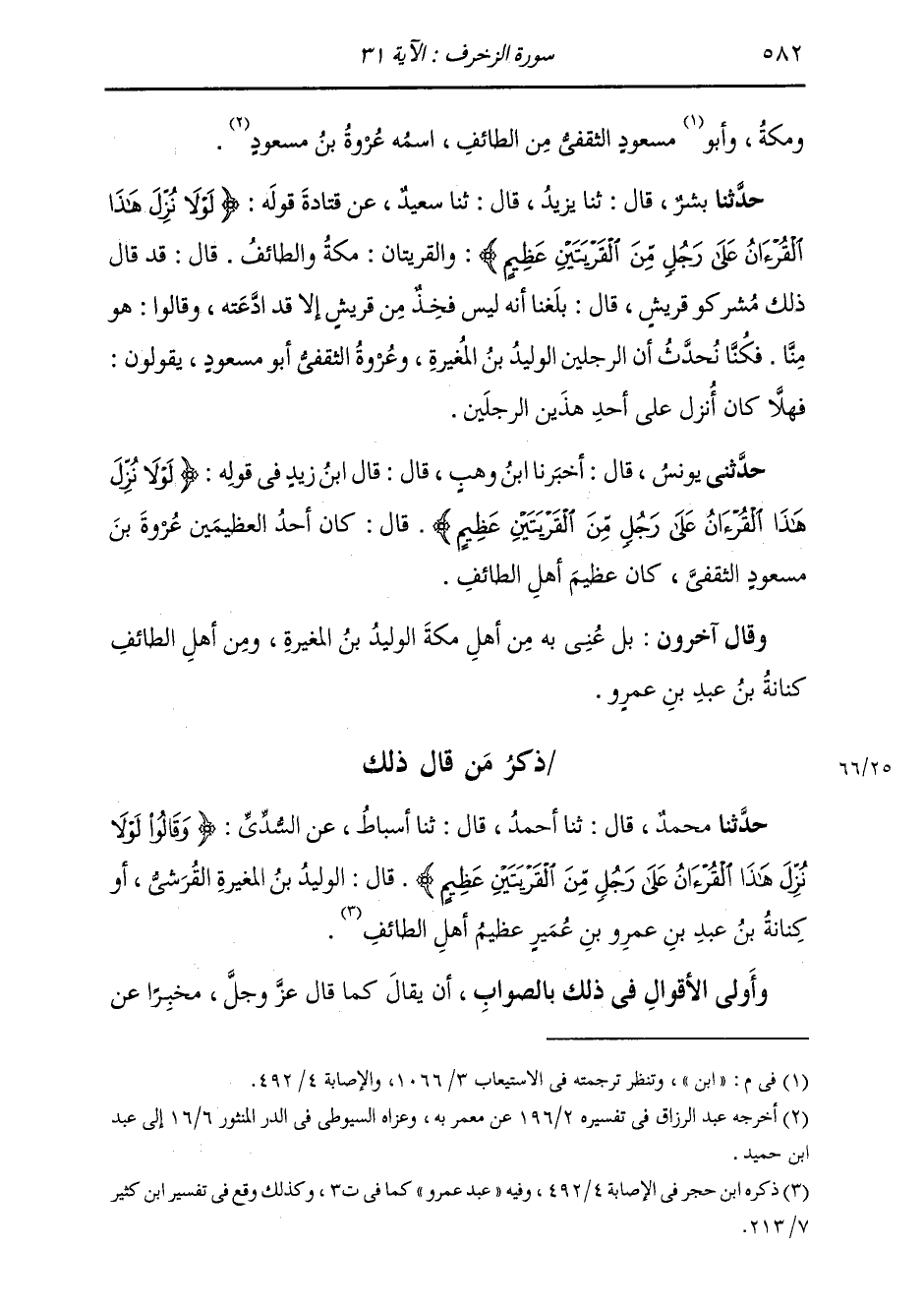 حَدَّثَنَا بِشْرٌ قَالَ: ثَنَا يَزِيدُ قَالَ: ثَنَا سَعِيدٌ، عَنْ قَتَادَةَ، قَوْلَهُ: {§لَوْلَا نُزِّلَ هَذَا الْقُرْآنُ عَلَى رَجُلٍ مِنَ الْقَرْيَتَيْنِ عَظِيمٍ} [الزخرف: 31] " وَالْقَرْيَتَانِ: مَكَّةُ وَالطَّائِفُ؛ قَالَ: قَدْ قَالَ ذَلِكَ مُشْرِكُو قُرَيْشٍ قَالَ: بَلَغَنَا أَنَّهُ لَيْسَ فَخْذٌ مِنْ قُرَيْشٍ إِلَّا قَدِ ادَّعَتْهُ، وَقَالُوا: هُوَ مِنَّا، فَكُنَّا نُحَدِّثُ أَنَّ الرَّجُلَيْنِ: الْوَلِيدُ بْنُ الْمُغِيرَةِ، وَعُرْوَةُ الثَّقَفِيُّ أَبُو مَسْعُودٍ، يَقُولُونَ: هَلَّا كَانَ أُنْزِلَ عَلَى أَحَدِ هَذَيْنِ الرَّجُلَيْنِ "