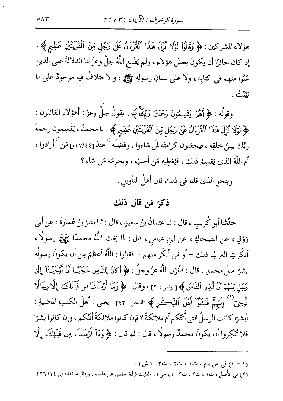 ذِكْرُ مَنْ قَالَ ذَلِكَ: حَدَّثَنَا أَبُو كُرَيْبٍ قَالَ: ثَنَا عُثْمَانُ بْنُ سَعِيدٍ قَالَ: ثَنَا بِشْرُ بْنُ عُمَارَةَ، عَنْ أَبِي رَوْقٍ، عَنِ الضَّحَّاكِ، عَنِ ابْنِ عَبَّاسٍ قَالَ: " §لَمَّا بَعَثَ اللَّهُ مُحَمَّدًا رَسُولًا، أَنْكَرَتِ الْعَرَبُ ذَلِكَ، وَمَنْ أَنْكَرَ مِنْهُمْ، فَقَالُوا: اللَّهُ أَعْظَمُ مِنْ أَنْ يَكُونَ رَسُولُهُ بَشَرًا مِثْلَ مُحَمَّدٍ قَالَ: فَأَنْزَلَ اللَّهُ عَزَّ وَجَلَّ: {أَكَانَ لِلنَّاسِ عَجَبًا أَنْ أَوْحَيْنَا إِلَى رَجُلٍ مِنْهُمْ أَنْ أَنْذَرِ النَّاسَ} [يونس: 2] " وَقَالَ {وَمَا أَرْسَلْنَا مِنْ قَبْلِكَ إِلَّا رِجَالًا نُوحِي إِلَيْهِمْ فَاسْأَلُوا أَهْلَ الذِّكْرِ} [النحل: 43] يَعْنِي: أَهْلَ الْكُتُبِ الْمَاضِيَةِ، أَبَشَرًا كَانَتِ الرُّسُلُ الَّتِي أَتَتْكُمْ أَمْ مَلَائِكَةً؟ فَإِنْ كَانُوا مَلَائِكَةً أَتَتْكُمْ، وَإِنْ كَانُوا بَشَرًا فَلَا تُنْكِرُونَ أَنْ يَكُونَ مُحَمَّدٌ رَسُولًا: قَالَ: ثُمَّ قَالَ: {وَمَا أَرْسَلْنَا مِنْ قَبْلِكَ إِلَّا -[584]- رِجَالًا نُوحِي إِلَيْهِمْ مِنْ أَهْلِ الْقُرَى} [يوسف: 109] أَيْ لَيْسُوا مِنْ أَهْلِ السَّمَاءِ كَمَا قُلْتُمْ؛ قَالَ: فَلَمَّا كَرَّرَ اللَّهُ عَلَيْهِمُ الْحُجَجَ قَالُوا، وَإِذَا كَانَ بَشَرًا فَغَيْرُ مُحَمَّدٍ كَانَ أَحَقَّ بِالرِّسَالَةِ فَـ {لَوْلَا نُزِّلَ هَذَا الْقُرْآنُ عَلَى رَجُلٍ مِنَ الْقَرْيَتَيْنِ عَظِيمٍ} [الزخرف: 31] يَقُولُونَ: أَشْرَفُ مِنْ مُحَمَّدٍ صَلَّى اللهُ عَلَيْهِ وَسَلَّمَ، يَعْنُونَ الْوَلِيدَ بْنَ الْمُغِيرَةِ الْمَخْزُومِيَّ، وَكَانَ يُسَمَّى رَيْحَانَةَ قُرَيْشٍ، هَذَا مِنْ مَكَّةَ، وَمَسْعُودَ بْنَ عَمْرِو بْنِ عُبَيْدِ اللَّهِ الثَّقَفِيَّ مِنْ أَهْلِ الطَّائِفِ قَالَ: يَقُولُ اللَّهُ عَزَّ وَجَلَّ رَدًّا عَلَيْهِمْ {أَهُمْ يَقْسِمُونَ رَحْمَةَ رَبِّكَ} [الزخرف: 32] أَنَا أَفْعَلُ مَا شِئْتُ